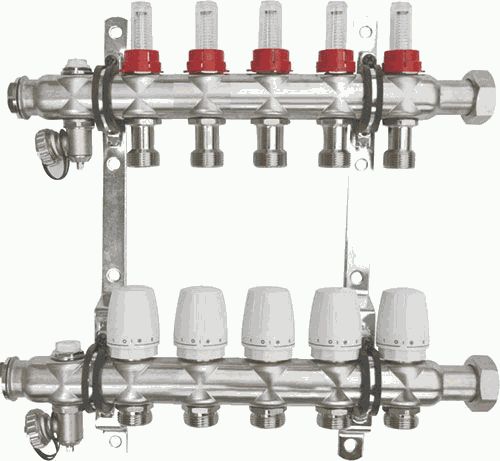 Коллекторный блок нерж.1""с накидной гайкой (расх-ми., регул. и дрен. клапанами, кронш.) 5 вых.14258 TeRma коллекторный блок из нержавеющей стали на 5 выходов служит для распределения потоков по контурам теплого пола, радиаторного отопления, прочих климатических систем, где в качестве теплоносителя используется вода либо незамерзающие растворы. Выходы обратного коллектора блока оборудованы термостатическими, подающего – настроечными клапанами. Коллекторы оснащены воздухоотводчиками с отсекающими клапанами, дренажными кранами, самоуплотняющимися пробками. Стандарт присоединения трубных петель – «евроконус» на 3/4"". В комплект входят крепежные кронштейны, коллекторный блок имеет диаметр подключения 1 дюйм с внутренней резьбой.