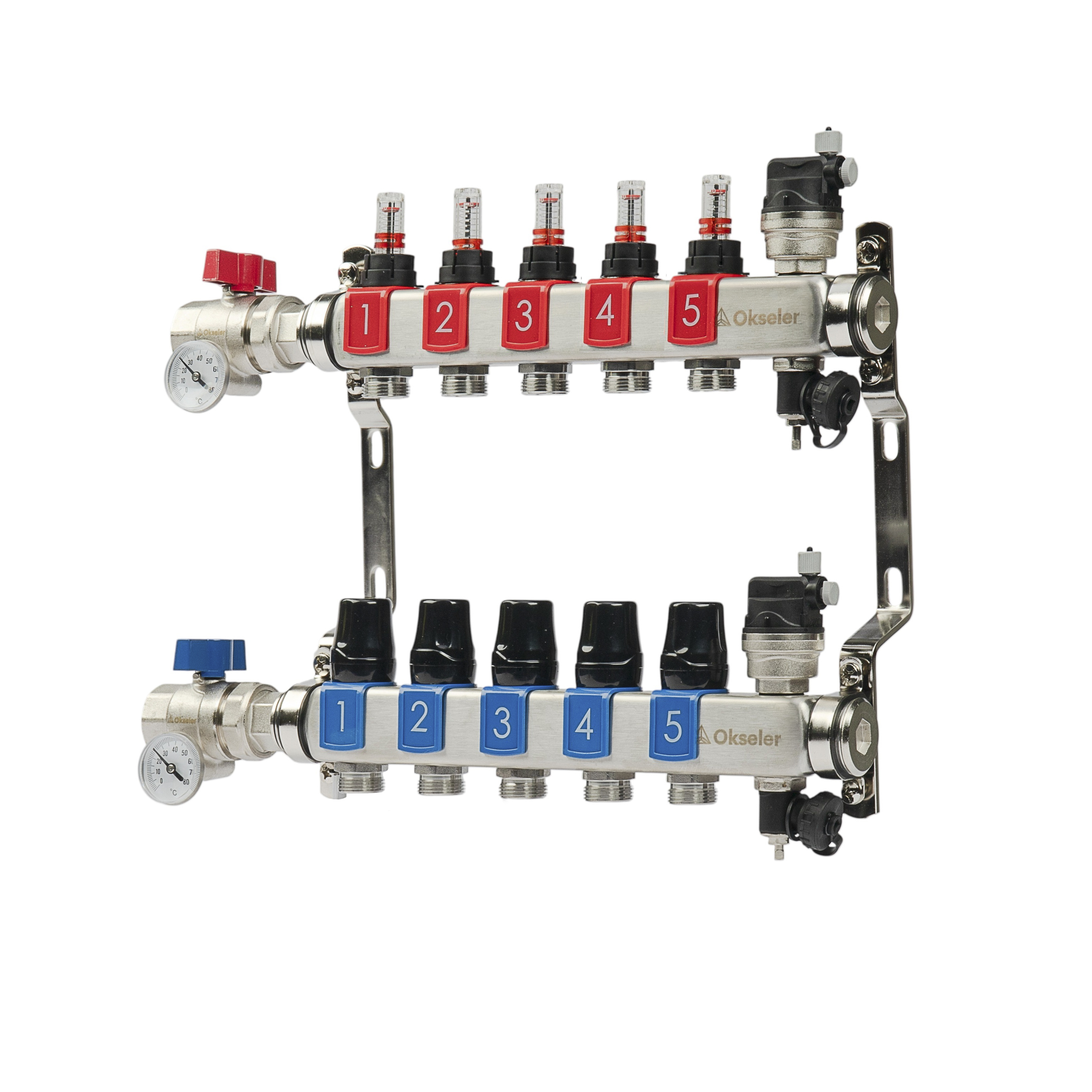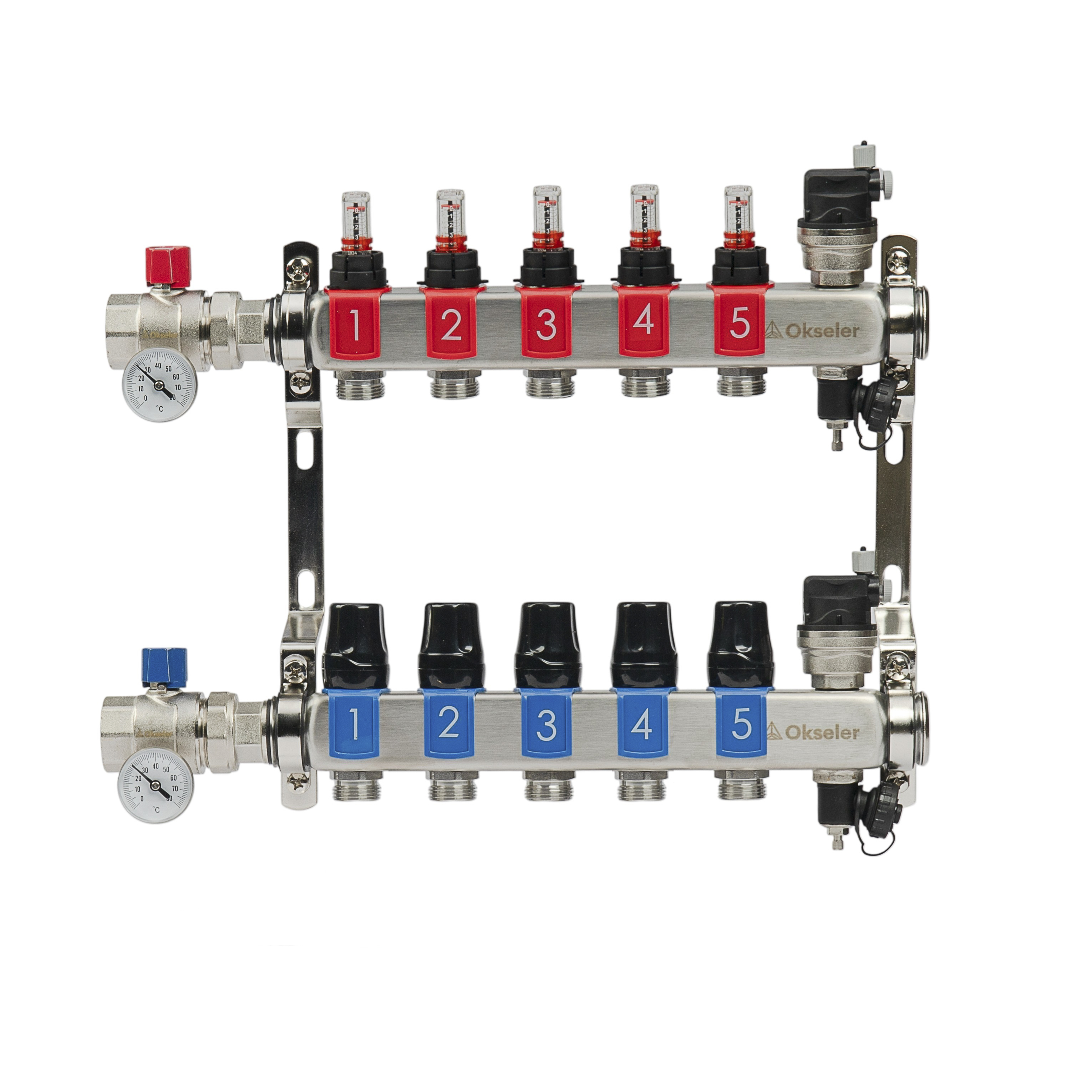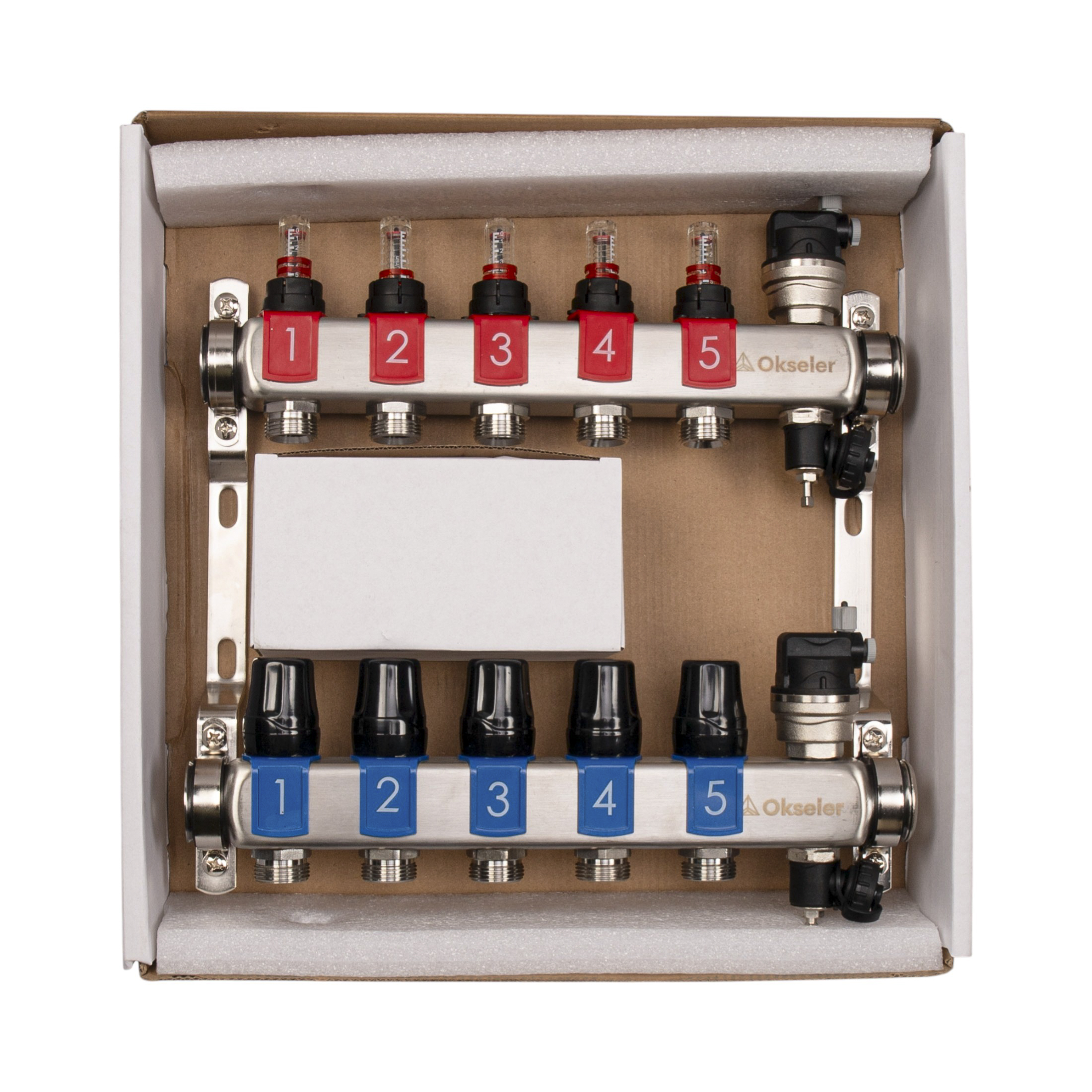 Коллекторный блок OKSELER на 5 выхода с расходомерами и автоматическими воздухоотводчиками — надежное решение для систем отопления и теплых полов. Обеспечивает контроль расхода и температуры теплоносителя, простоту монтажа и обслуживания, а также долговечность благодаря нержавеющей стали AISI 304.