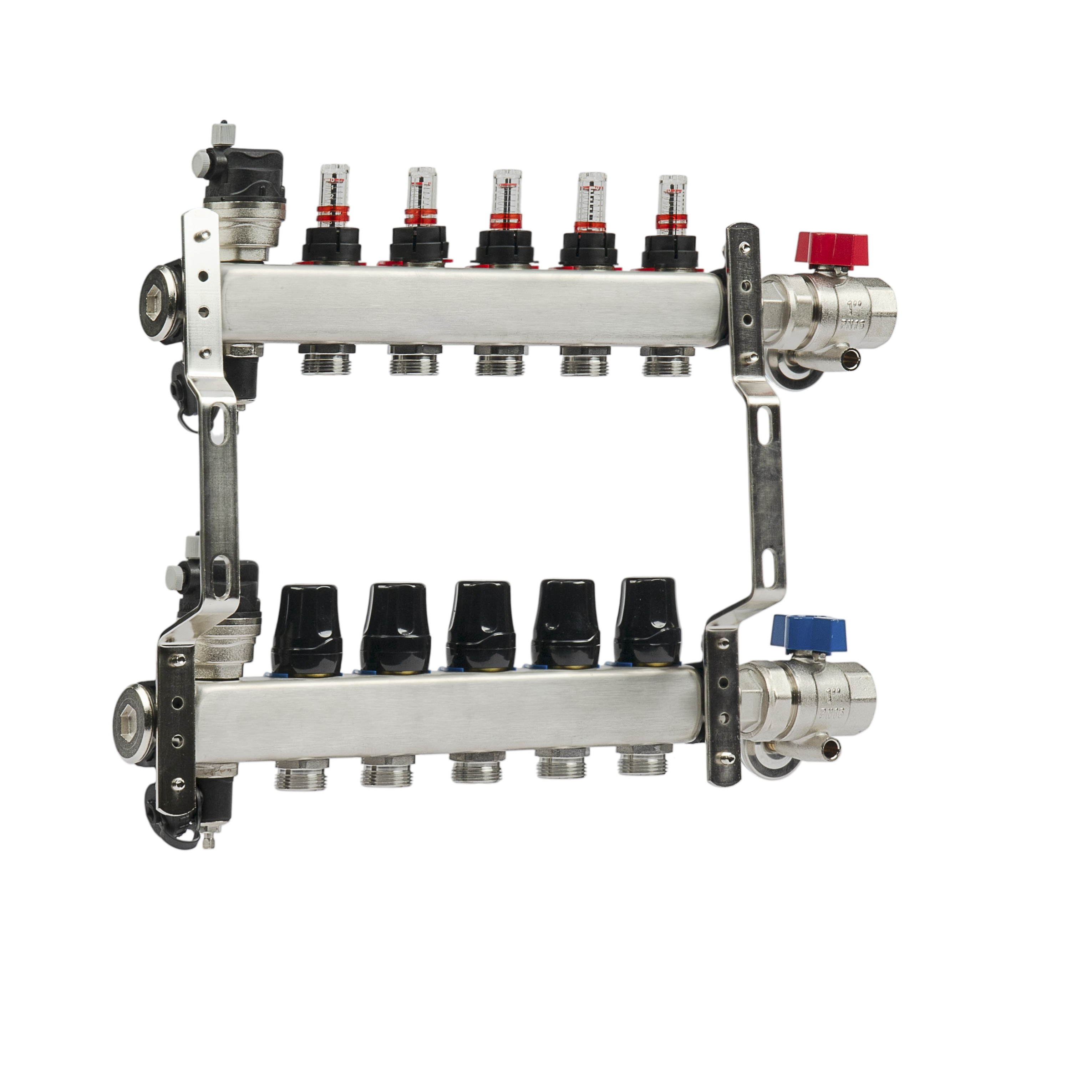 Коллекторная группа 5 отводов 1"*3/4"(18) ЕК с расходомерами Okseler (нерж.ст) с автоматическими воздухоотводчикоми и шаровыми кранами с термометрами