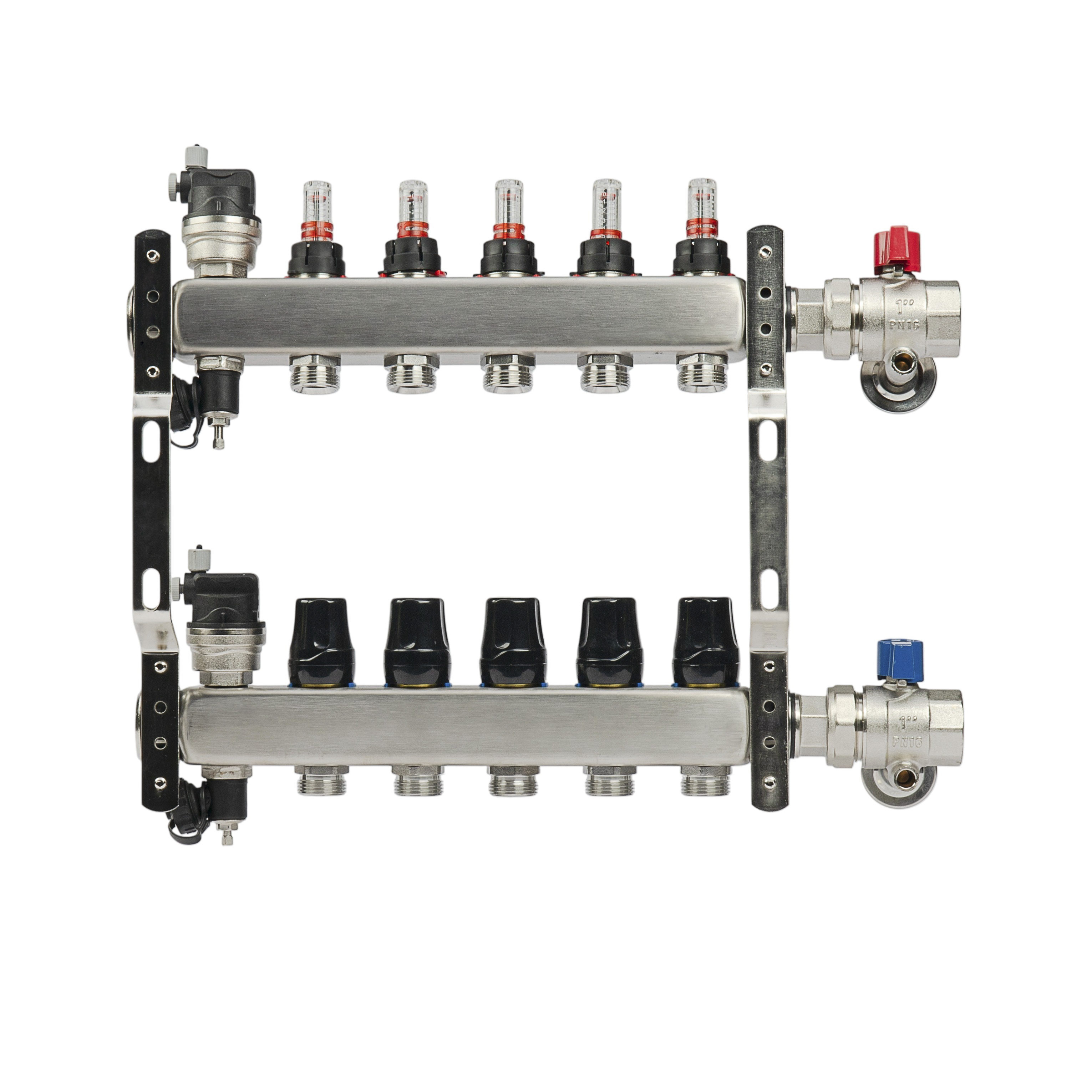Коллекторный блок OKSELER на 5 выхода с расходомерами и автоматическими воздухоотводчиками предназначен для систем водяного отопления и теплого пола. Обеспечивает точное распределение теплоносителя по двум контурам с контролем расхода и температуры. Изготовлен из нержавеющей стали AISI 304 для долговечной и надежной работы в системах отопления.
