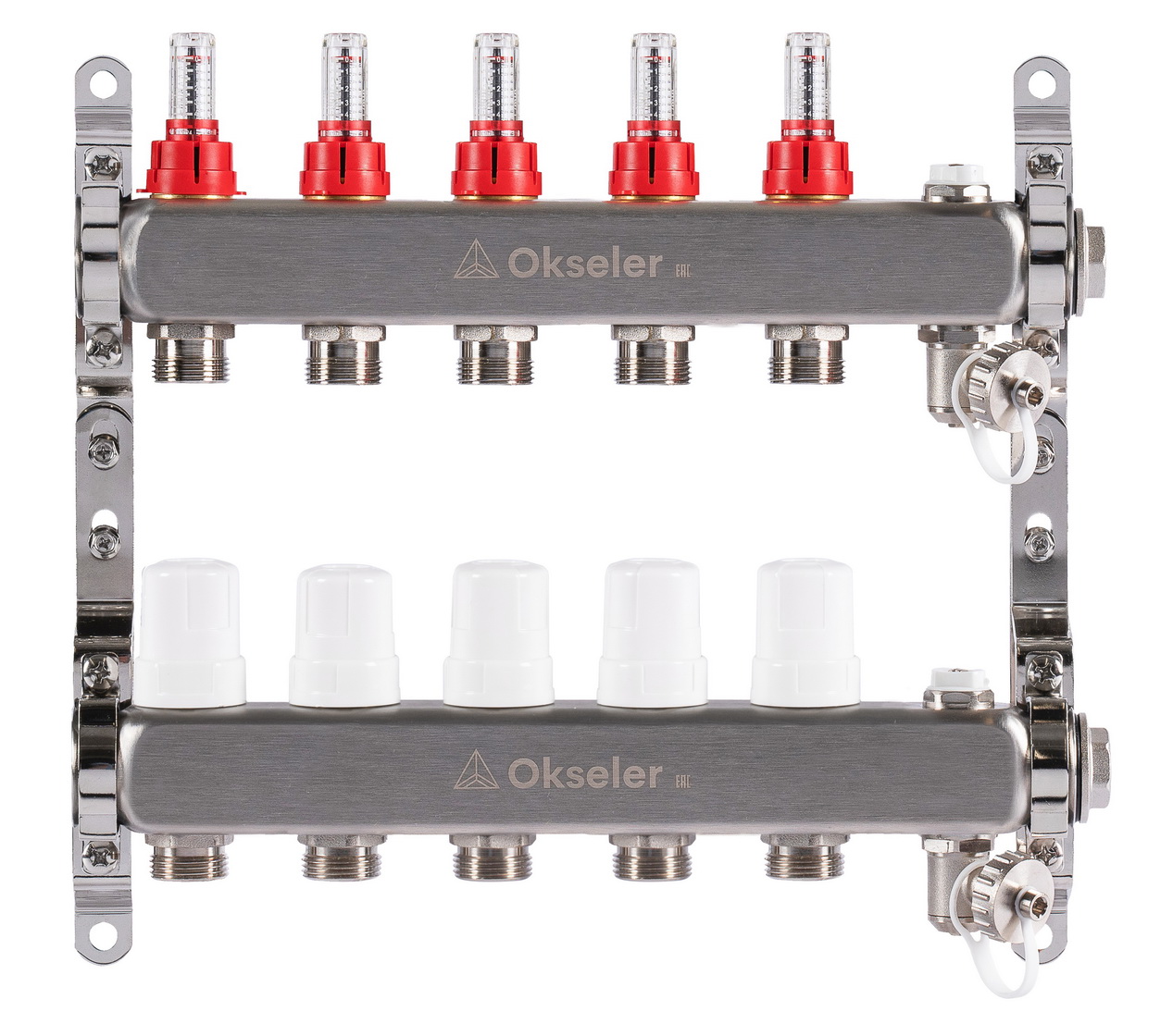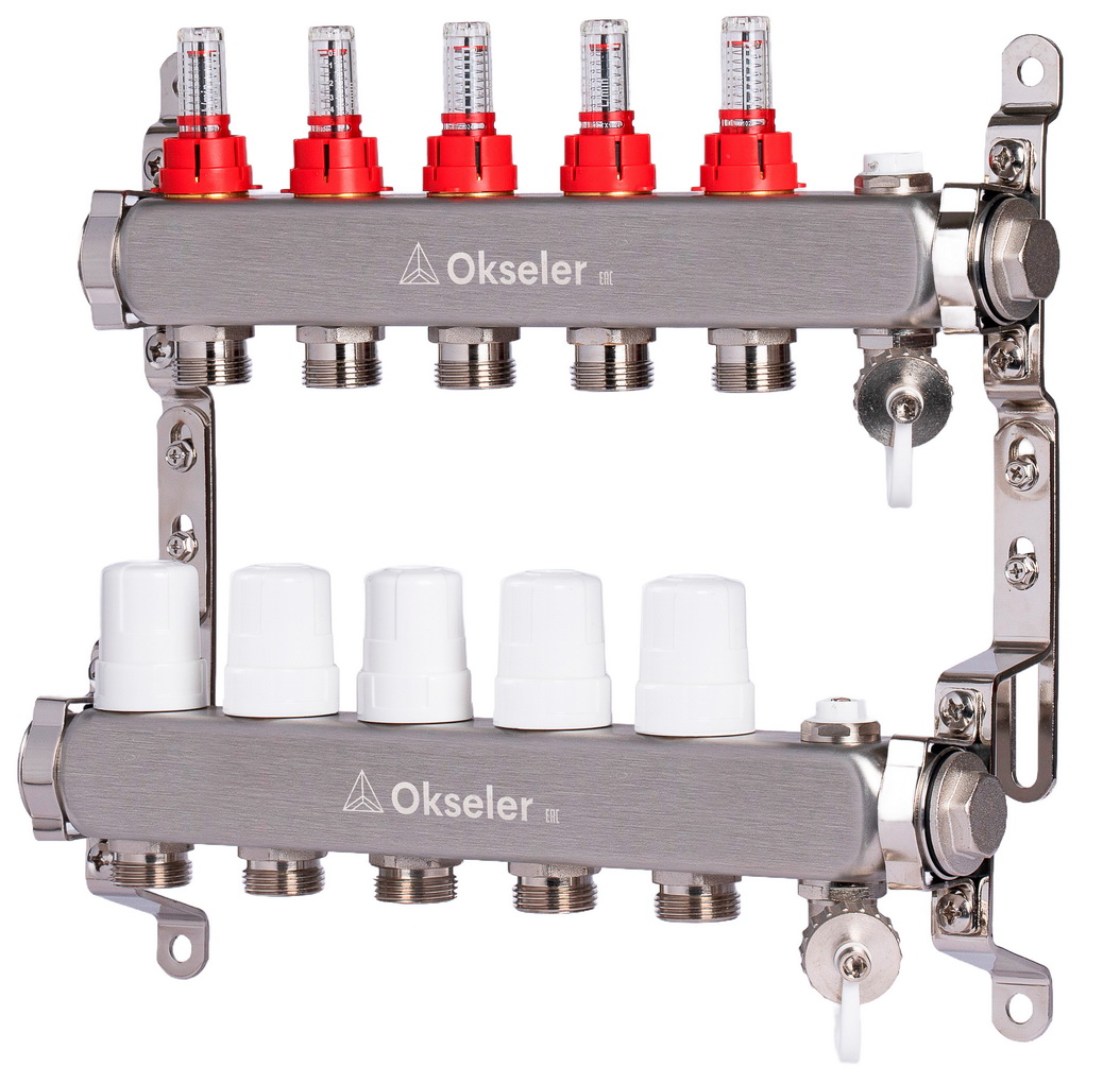 Коллекторный блок Okseler с 5 выходами — это эффективное решение для распределения теплоносителя в системах тёплого водяного пола и отопления. Блок включает подающую гребёнку с индивидуальными расходомерами для каждого контура и обратную гребёнку с термостатическими клапанами, что обеспечивает точную настройку и возможность автоматического управления (при установке сервоприводов).