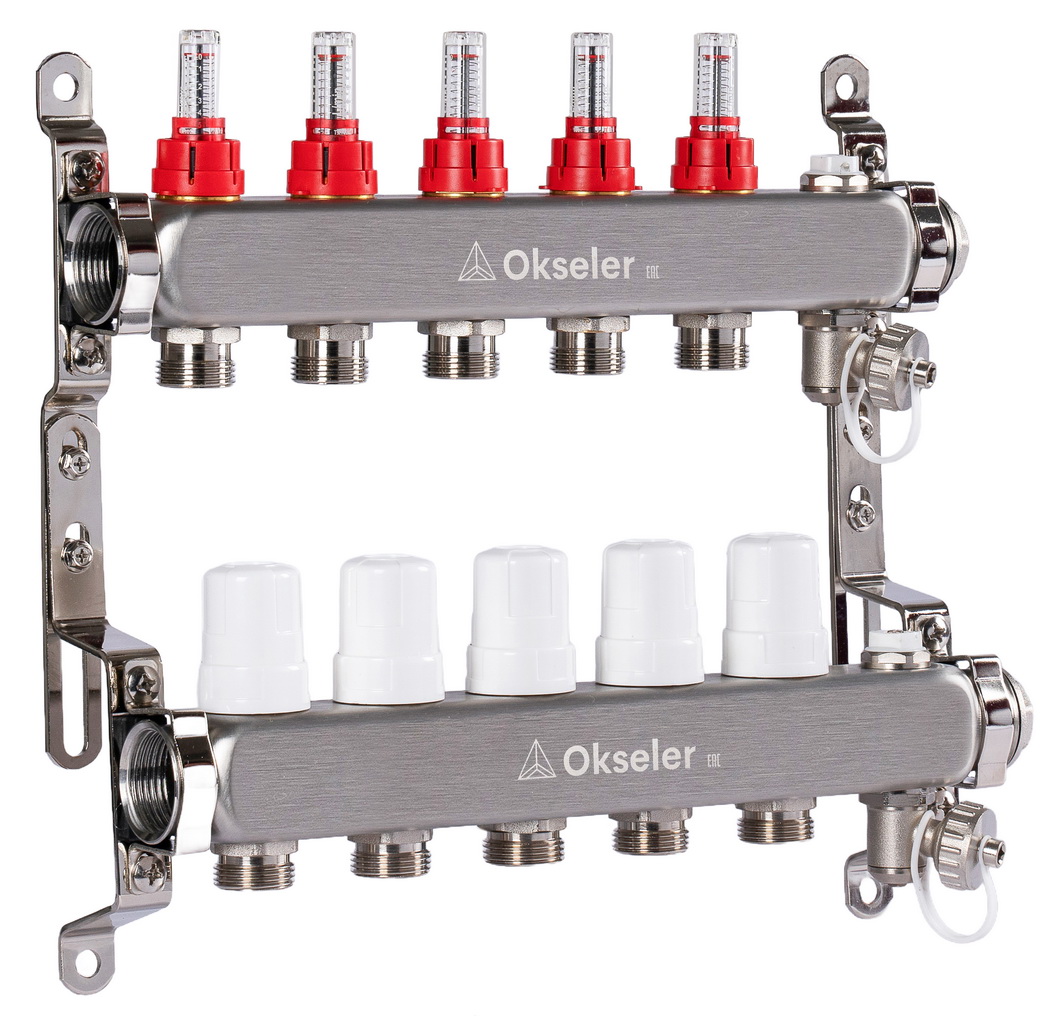 Коллекторный блок Okseler на 5 выходов с расходомерами, дренажным краном и краном Маевского