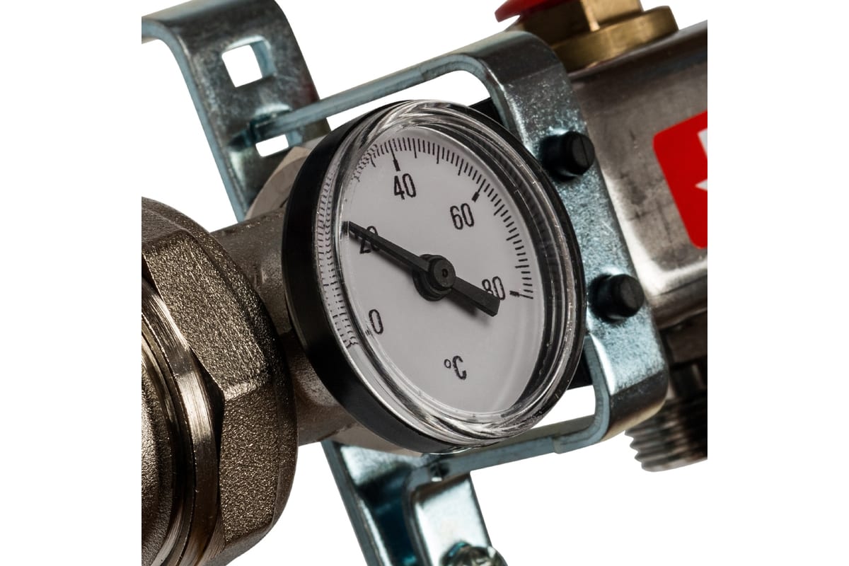 Комплектация: Шаровой кран с разъёмным соединением - 2, вставка со стрелочным термометром - 2, кронштейн - 2, коллектор подающий, штуцер под компрессионный фитинг типа «Евроконус» - 2, коллектор обратный, клапан терморегулятора с регулирующим колпачком - 2, запорно-балансировочный клапан - 2, автоматический воздухоотводчик - 2, спускной кран с крышкой-ключом - 2