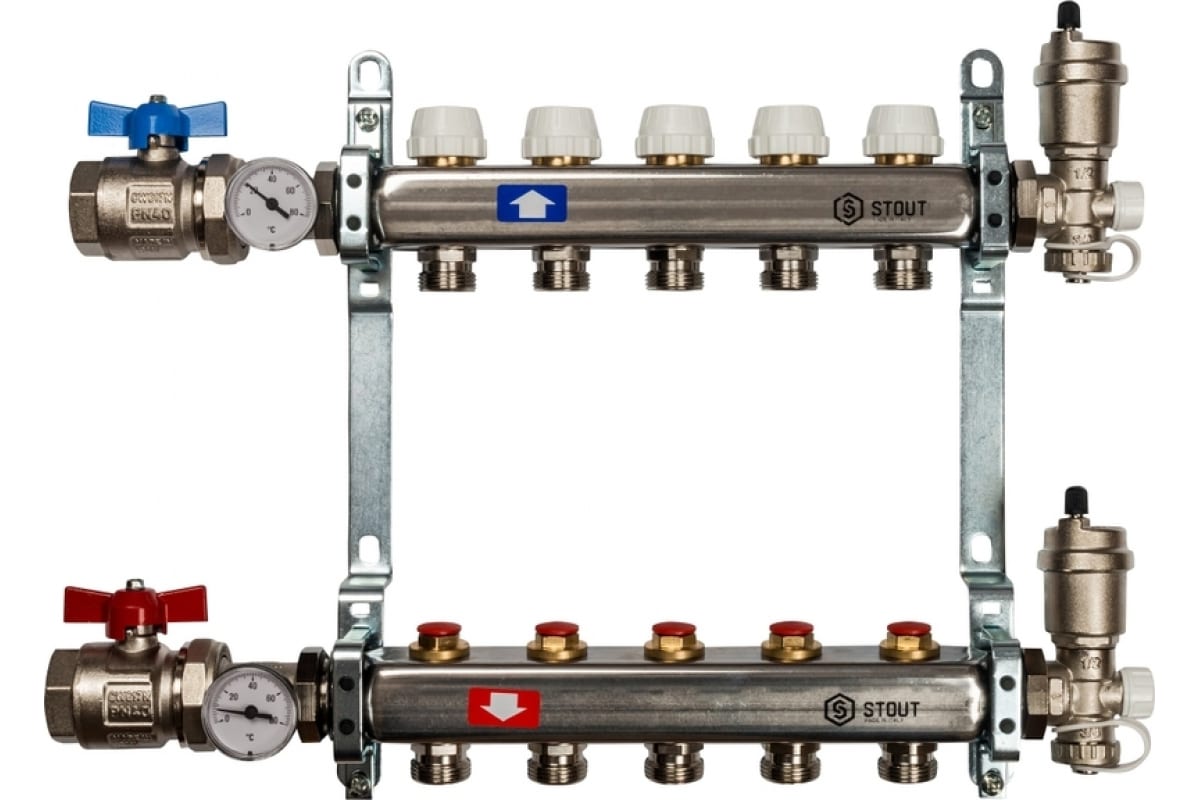 Коллектор из нержавеющей стали в сборе без расходомеров STOUT используется в зданиях с поквартирной разводкой трубопроводов. Изделие может использоваться с трубами из любых материалов. Коллектор служит для подачи и распределения теплоносителя.