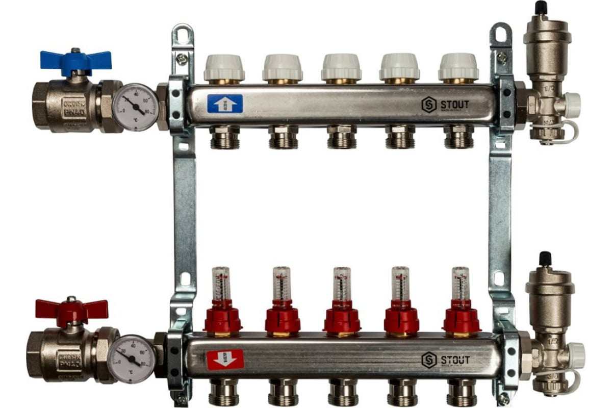 Коллекторная группа STOUT Италия. Коллектор STOUT обладет рядом преимуществ, среди которых надежность конструкции, качественные материалы, оптимальная комплектация блока, варианты исполнения для теплого пола и для радиаторной разводки. Назначение коллекторных блоков- эффективно распределить теплоноситель по отопительным контурам.