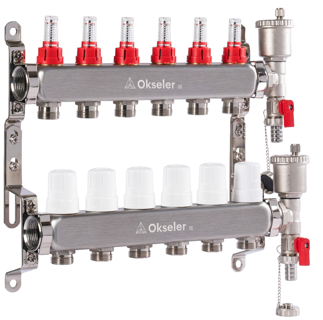 Коллекторный блок Okseler с 6 выходами представляет собой распределительный коллектор для систем отопления и теплого водяного пола, оборудованный расходомерами и автоматическими воздухоотводчиками. Конструкция состоит из подающей и обратной гребенок, каждая из которых может иметь от 2 до 12 выходов. Подающая гребенка оснащена расходомерами для точной регулировки каждого контура, а обратная — термостатическими клапанами с возможностью установки термоэлектрических сервоприводов.