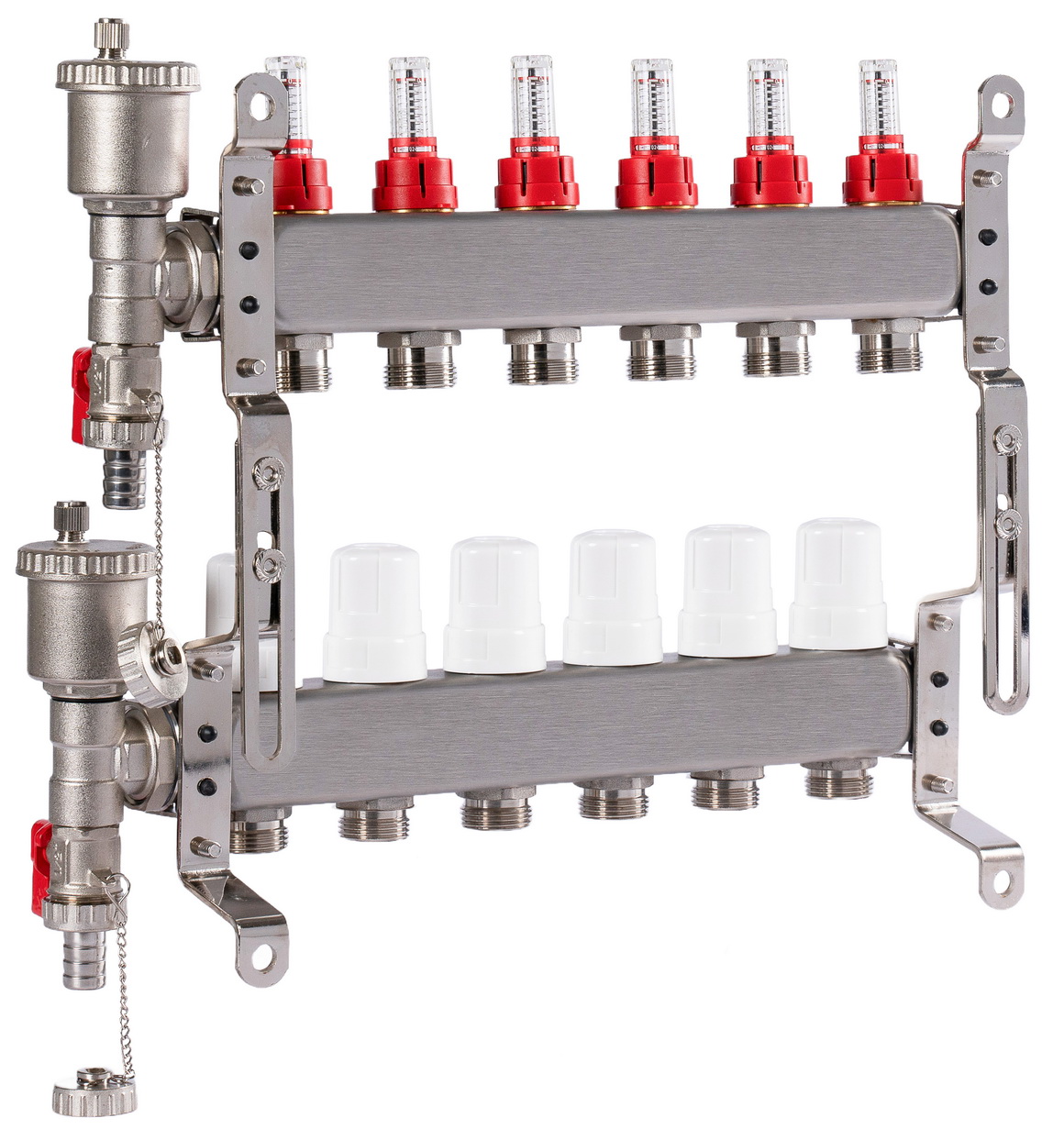 Коллекторная группа 6 отводов 1"*3/4"(18) ЕК с расходомерами Okseler (нерж.ст) с автоматическим воздухоотводчиком и спускным краном (Oks00344)