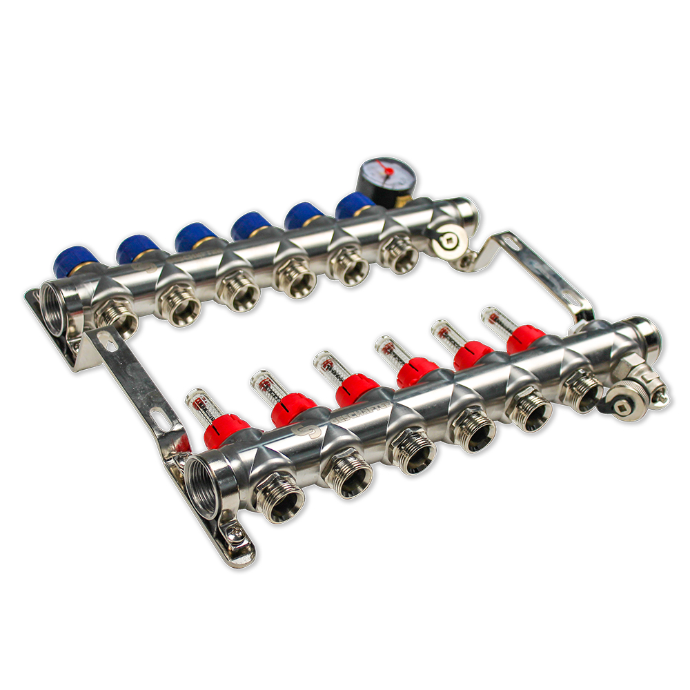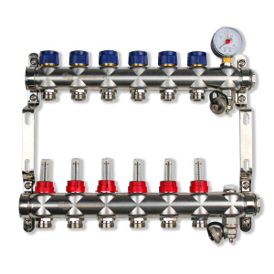 Качественные коллекторы для систем теплого пола и отопления из нержавеющей стали. Предназначены для распределения теплоносителя от источника тепла к отопительными приборами (контурам теплого пола, радиаторам и т.д.). Отличие в том, что на каждом контуре вместо балансировочного клапана установлен расходомер, ещё одно название ротаметр. Расходомер позволяет визуально контролировать скорость потока (л/м) теплоносителя через контур.
