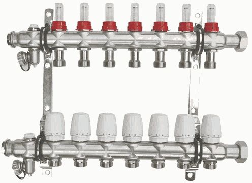 Коллекторный блок нерж.1"" с регулиров. клапанами и расходомер., воздухоотв., дрен., крон. 6 вых. 14102 коллекторный блок из нержавеющей стали на 6 выходов служит для распределения потоков по контурам теплого пола, радиаторного отопления, прочих климатических систем, где в качестве теплоносителя используется вода либо незамерзающие растворы. Выходы обратного коллектора блока оборудованы термостатическими, подающего – настроечными клапанами с расходомерами. Коллекторы оснащены воздухоотводчиками с отсекающими клапанами, дренажными кранами, самоуплотняющимися пробками. Стандарт присоединения трубных петель – «евроконус» на 3/4"". В комплект входят крепежные кронштейны, коллекторный блок имеет диаметр подключения 1 дюйм с внутренней резьбой.