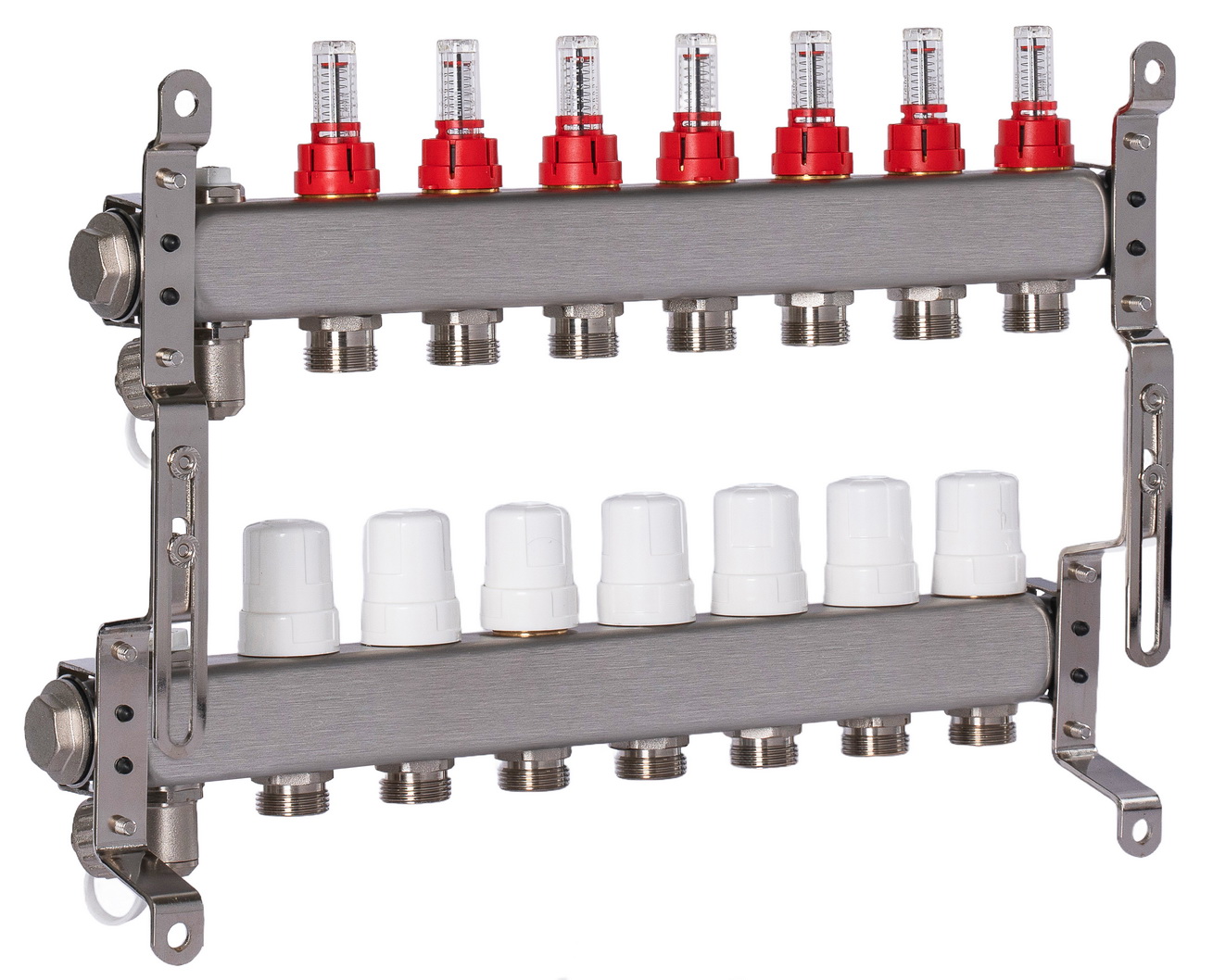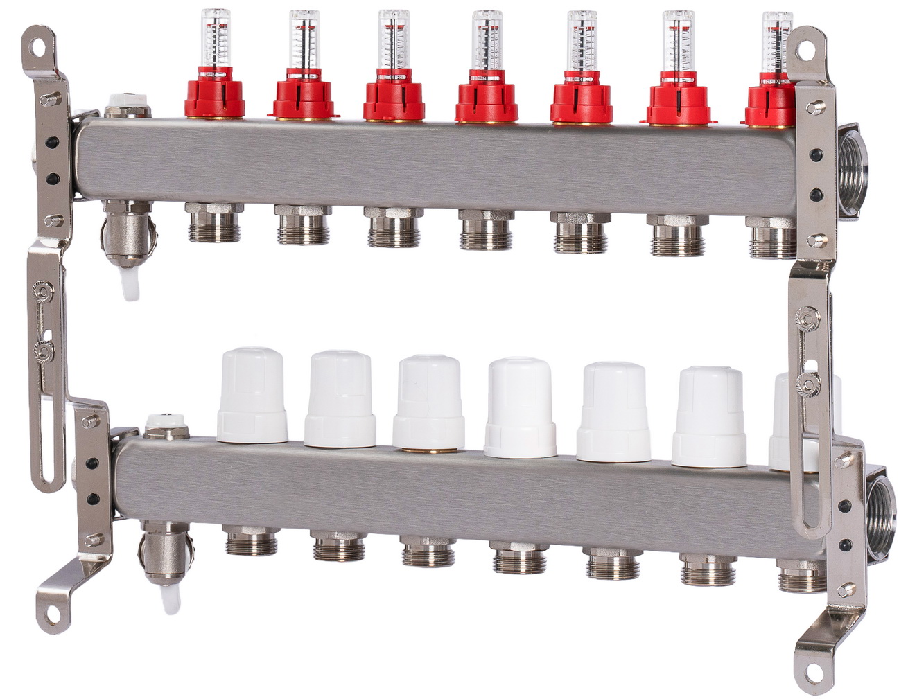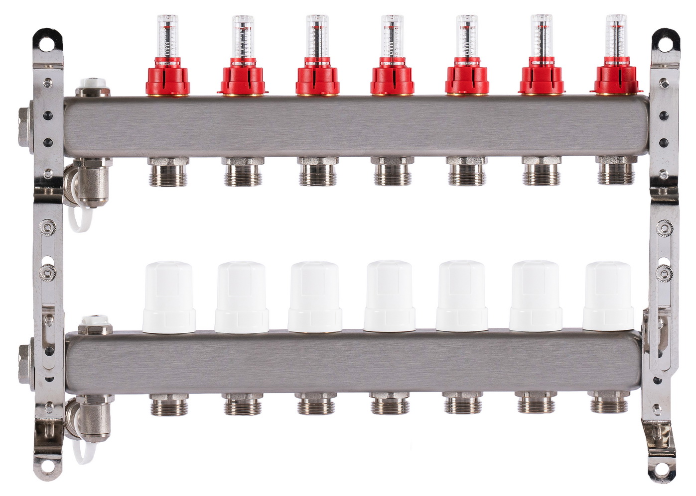 В комплект входят: подающая и обратная гребенка, расходомеры, дренажный кран, кран Маевского и раздвижные крепёжные кронштейны.