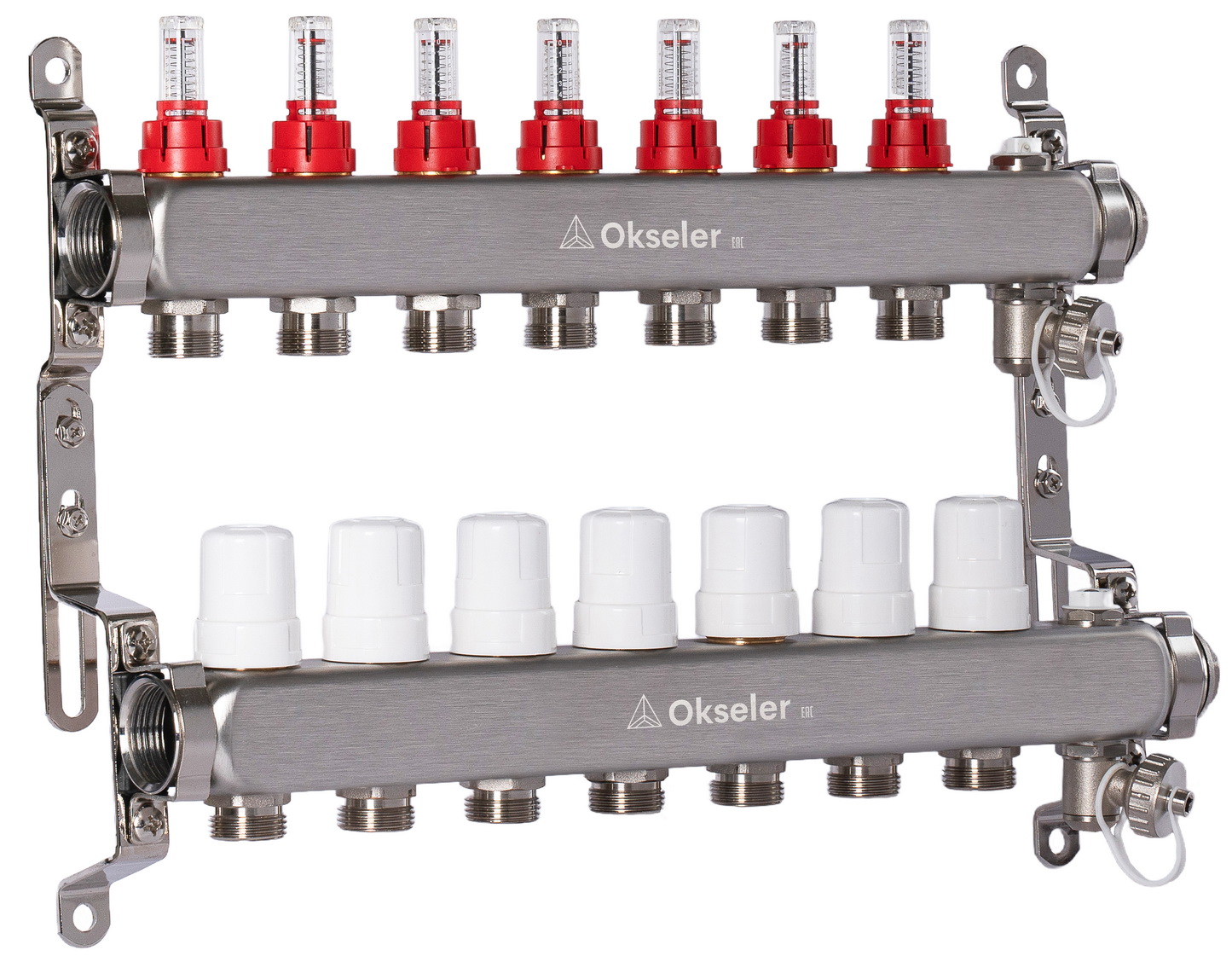 Коллекторный блок Okseler на 7 выходов с расходомерами, дренажным краном и краном Маевского
