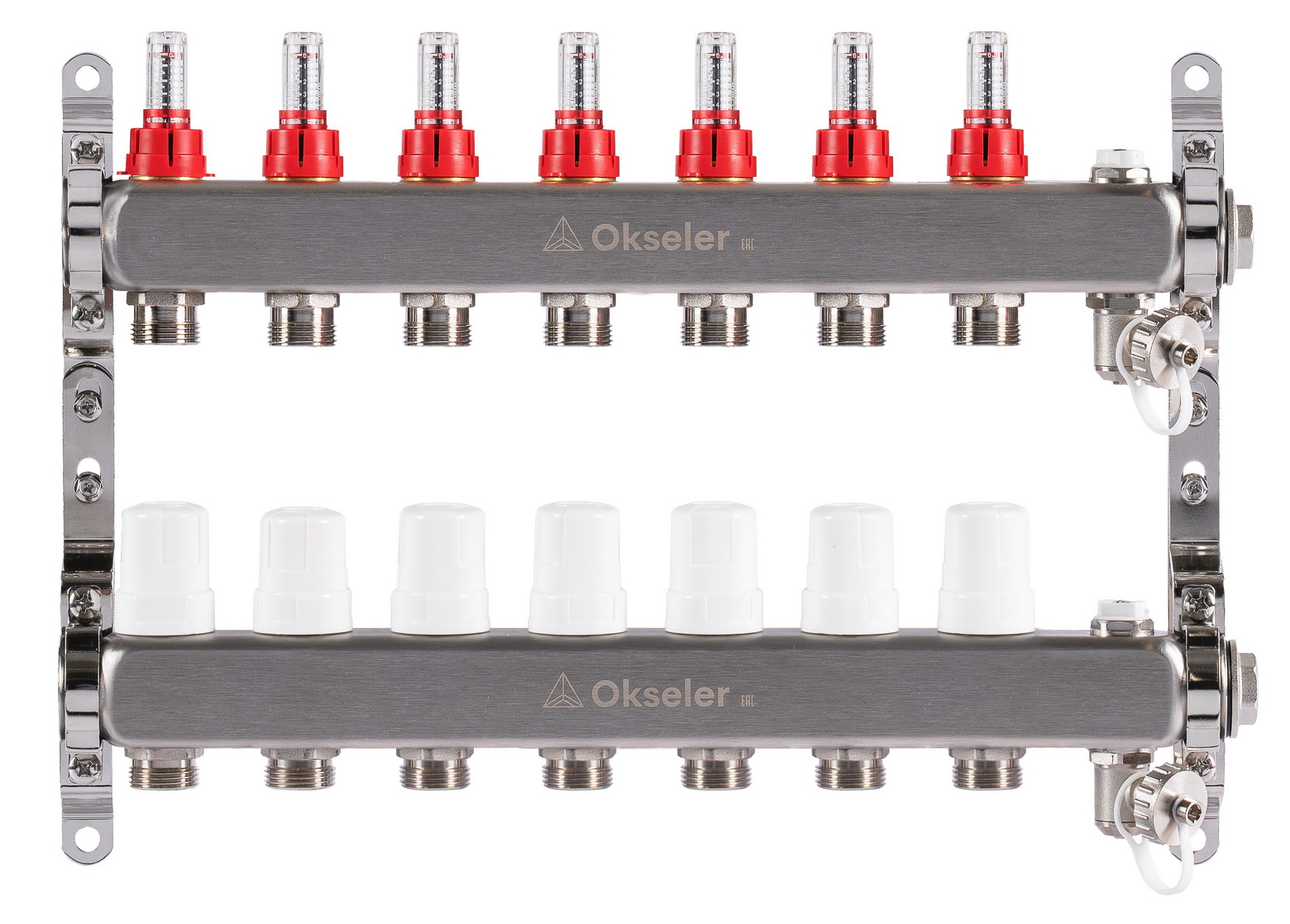 Коллекторный блок Okseler на 7 выходов — это высококачественное решение для распределения теплоносителя в системах отопления и тёплого водяного пола. Он включает в себя подающую и обратную гребенки: подающая оснащена расходомерами, обеспечивающими точную настройку каждого из 7 контуров, а обратная — термостатическими клапанами, совместимыми с термоэлектрическими сервоприводами (приобретаются отдельно).