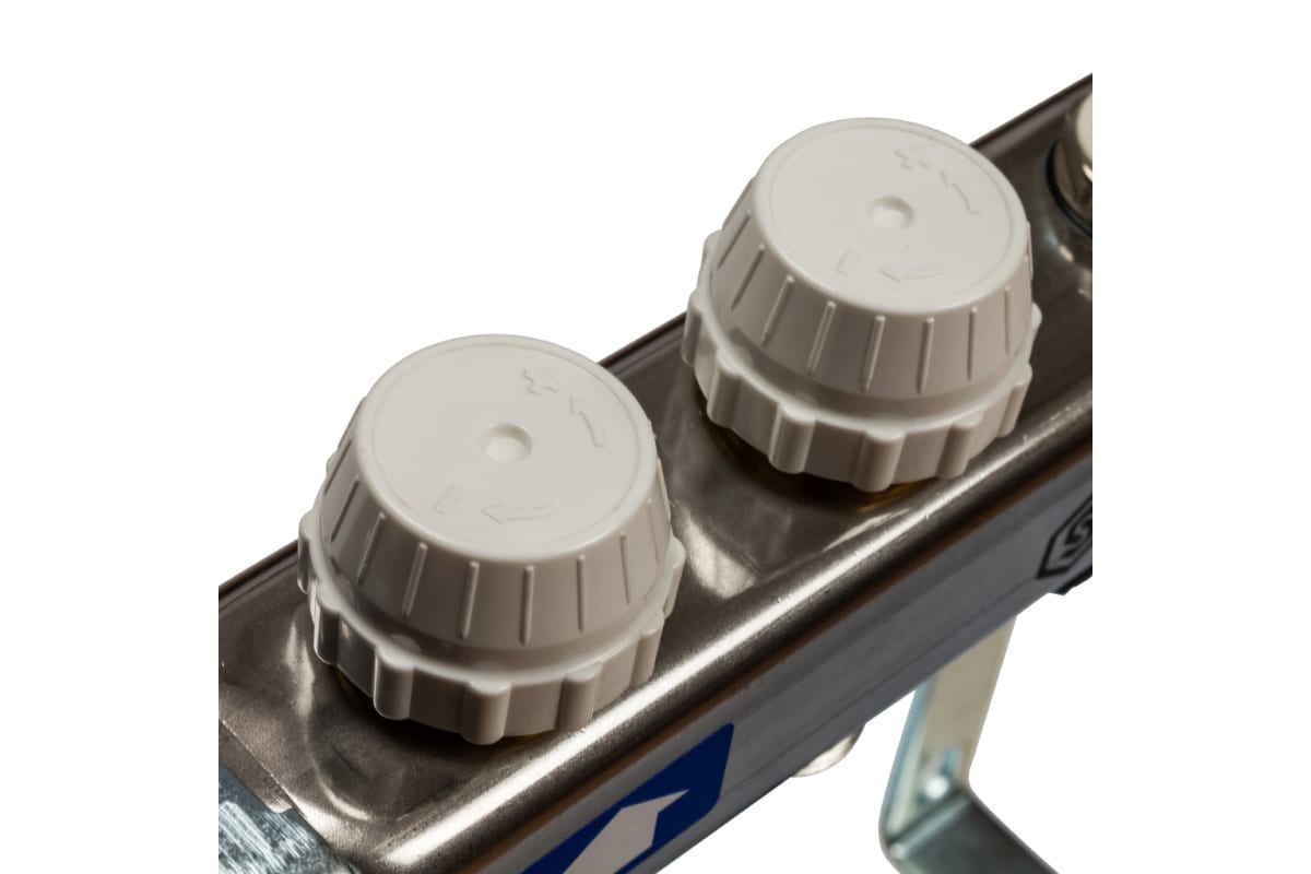 Преимуществом данной модели является наличие расходомеров, клапана сброса воздуха и клапана опорожнения системы. Конструкция позволяет регулировать нагрев каждого контура в отдельности, в данном случае их два.