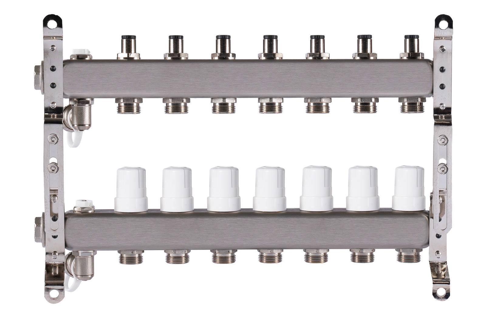 Коллектор способствует равномерному нагреву всех подключенных контуров, обеспечивает оптимальный гидравлический баланс системы и позволяет точно контролировать параметры теплоносителя. Это повышает энергоэффективность и продлевает срок службы отопительного оборудования. В комплект входят раздвижные монтажные кронштейны для удобной установки.