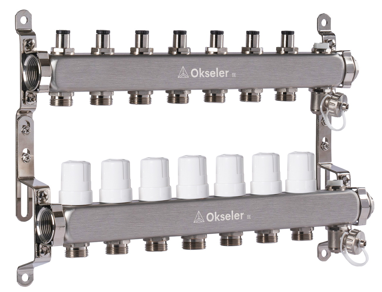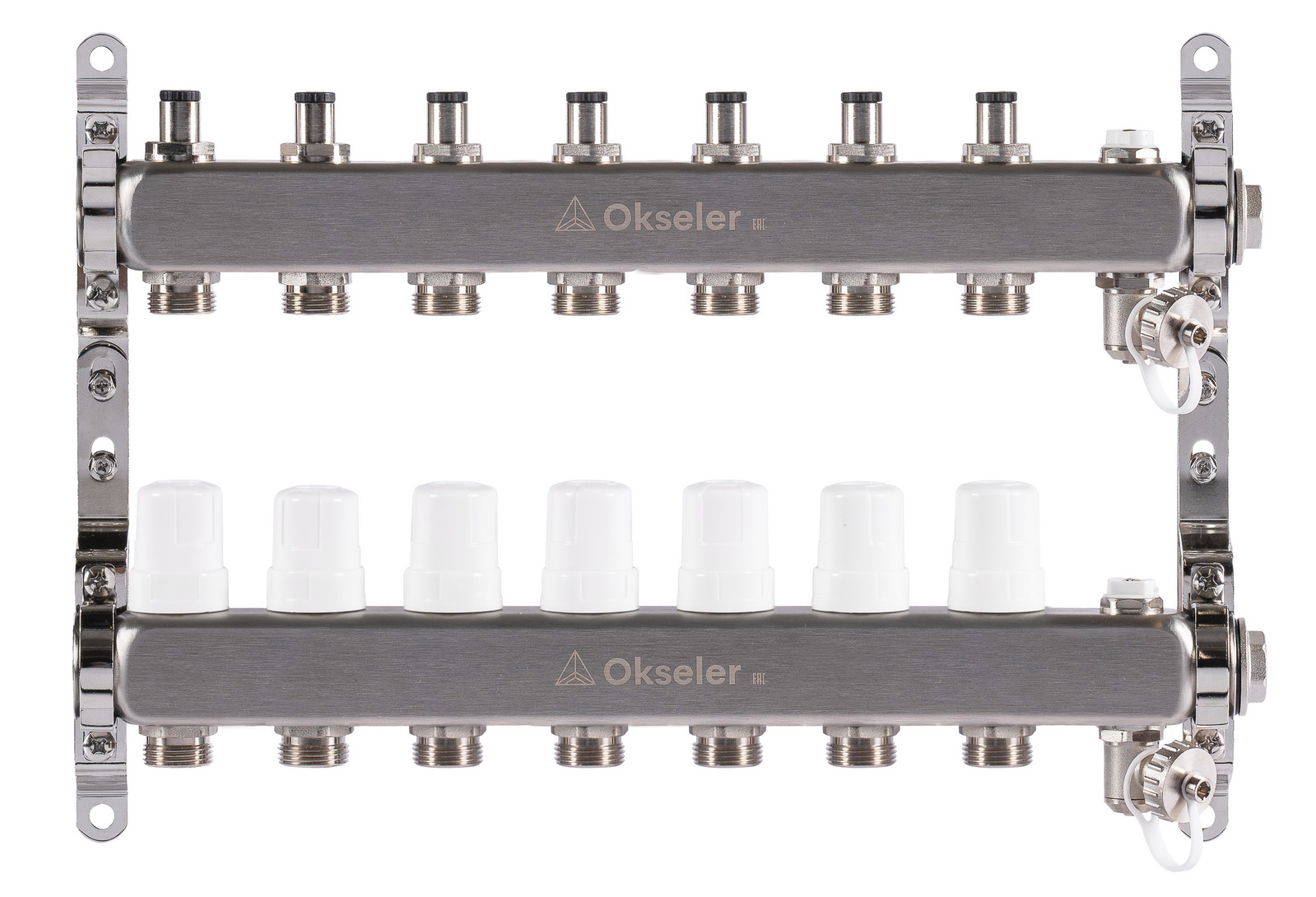 Коллекторная группа 7 отводов 1"*3/4"(18) ЕК с регулировочными клапанами Okseler (нерж.ст) с дренажным краном и краном Маевского (Oks00306)