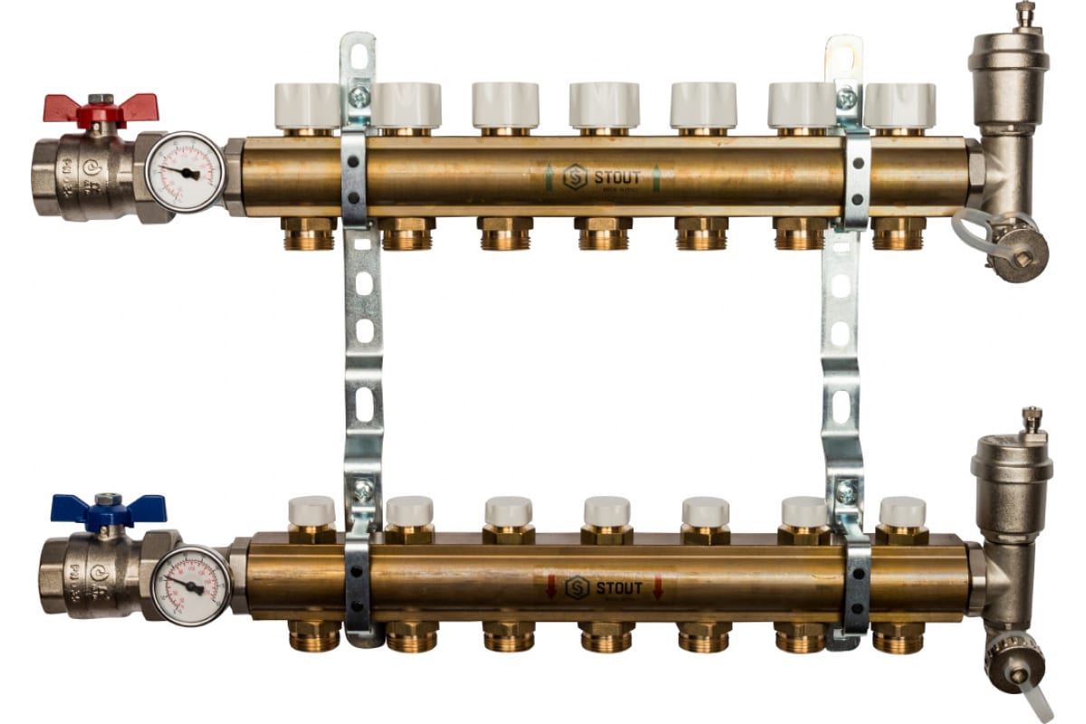 Коллекторная группа 7 отводов 1"x3/4"(18)EK в сборе без расходомеров Stout (латунь) (SMB-0468-000007)
