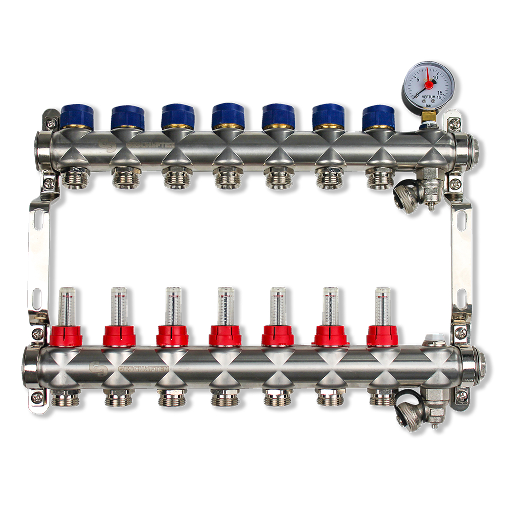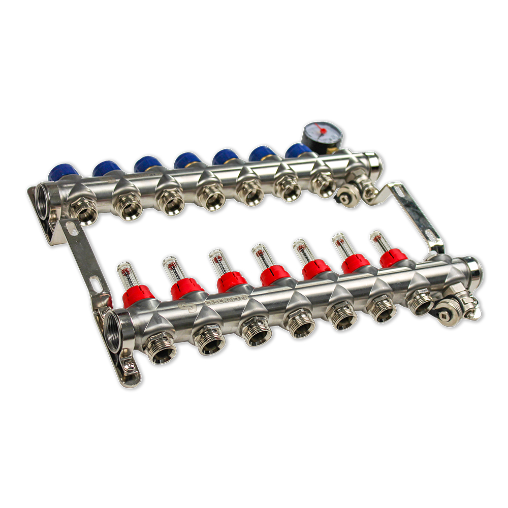 Качественные коллекторы для систем теплого пола и отопления из нержавеющей стали. Предназначены для распределения теплоносителя от источника тепла к отопительными приборами (контурам теплого пола, радиаторам и т.д.). Отличие в том, что на каждом контуре вместо балансировочного клапана установлен расходомер, ещё одно название ротаметр. Расходомер позволяет визуально контролировать скорость потока (л/м) теплоносителя через контур.