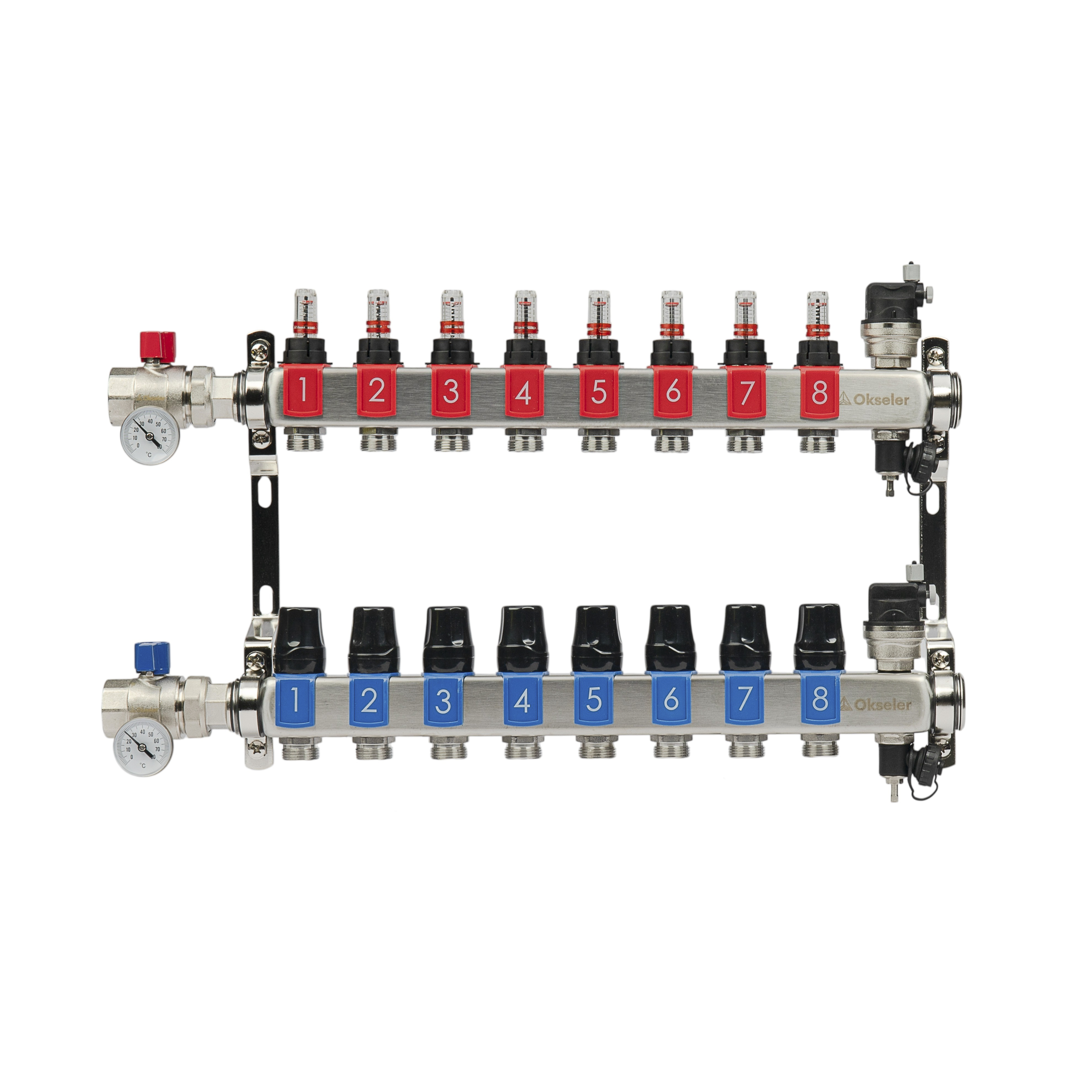 Коллекторный блок OKSELER на 8 выхода с расходомерами и автоматическими воздухоотводчиками предназначен для систем водяного отопления и теплого пола. Обеспечивает точное распределение теплоносителя по двум контурам с контролем расхода и температуры.