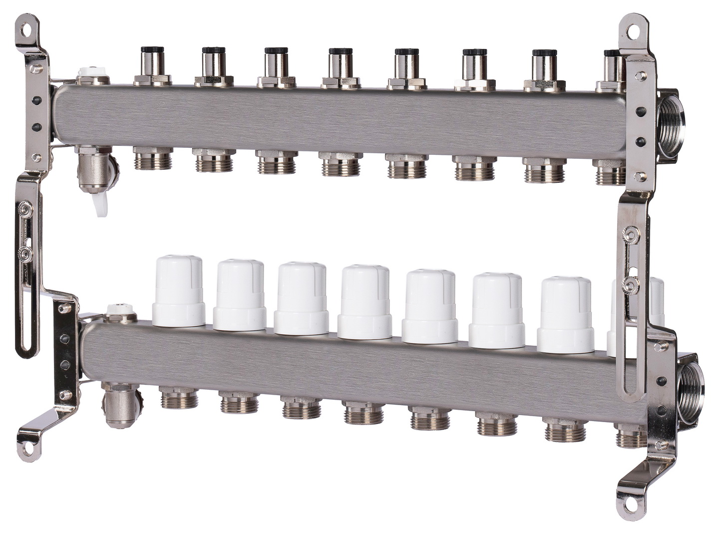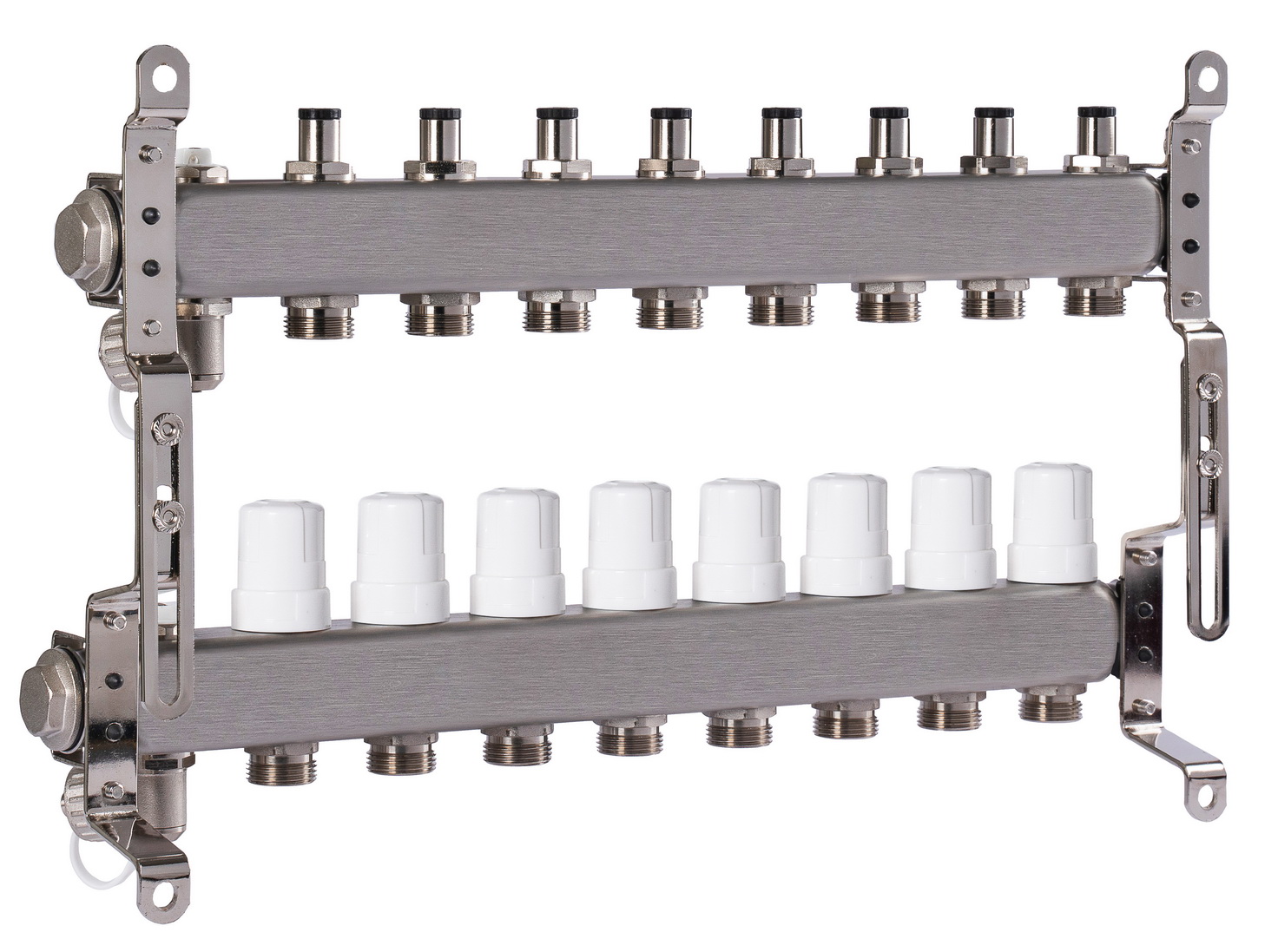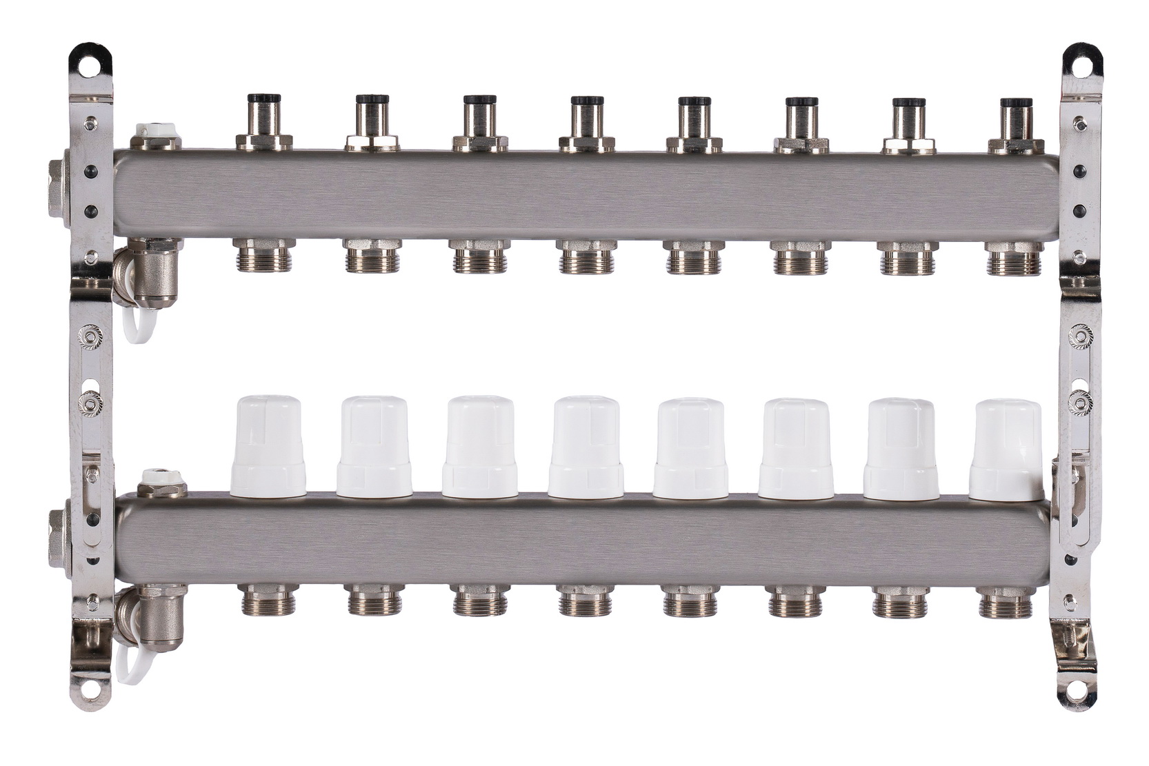 Данный коллектор обеспечивает стабильную и сбалансированную работу отопительных контуров, повышает энергоэффективность системы и позволяет добиться оптимального теплового комфорта в помещениях. В комплект поставки входят раздвижные кронштейны для удобного и надежного монтажа.