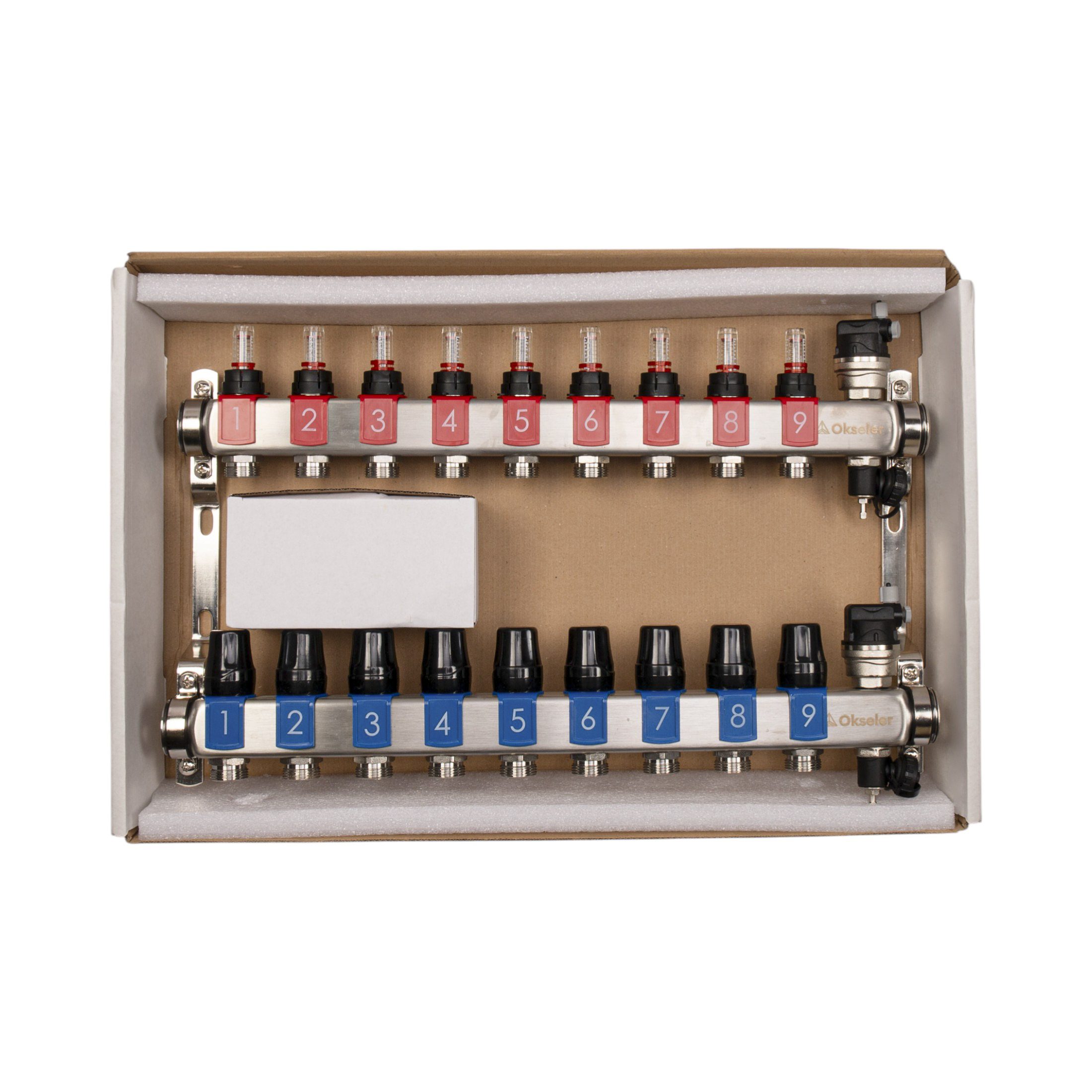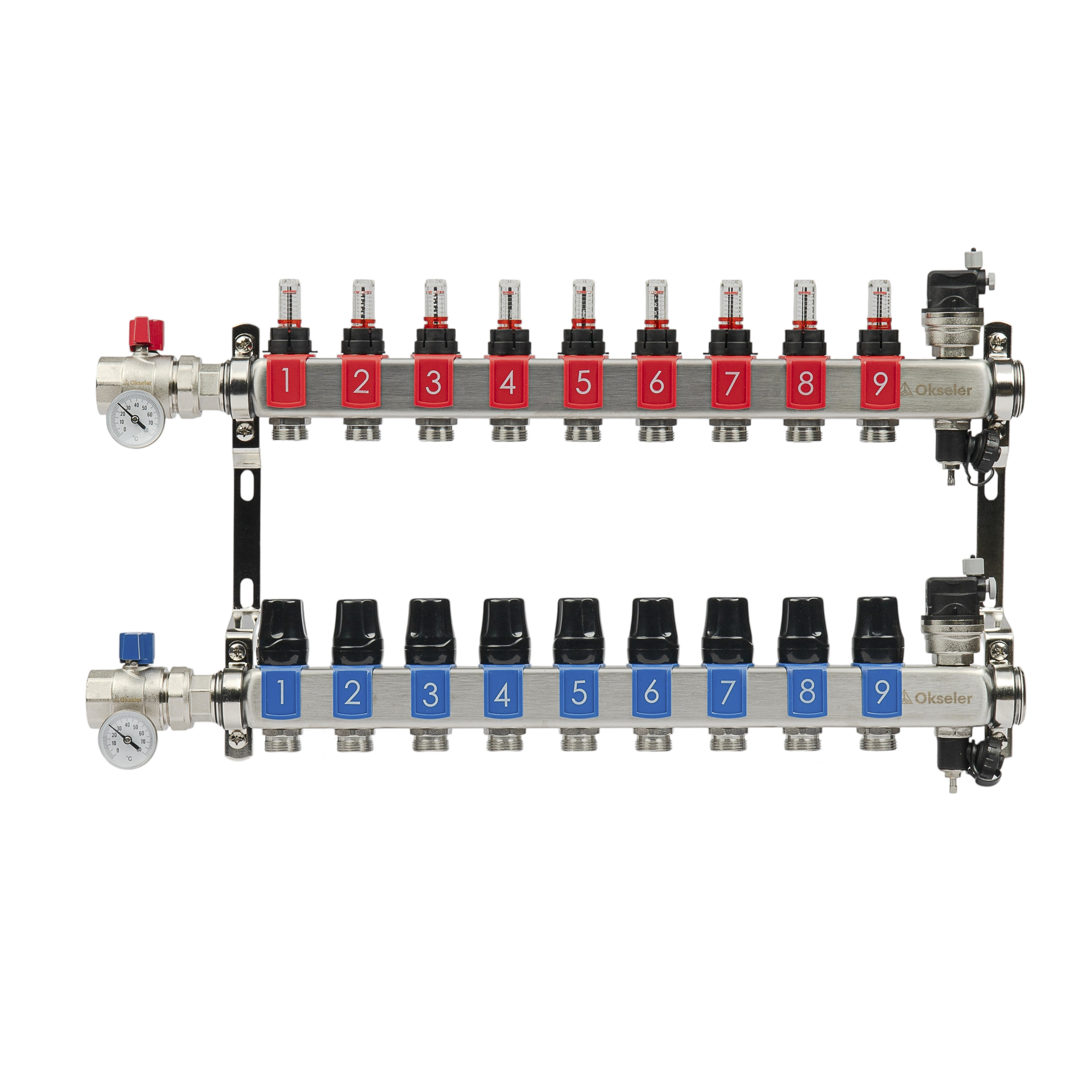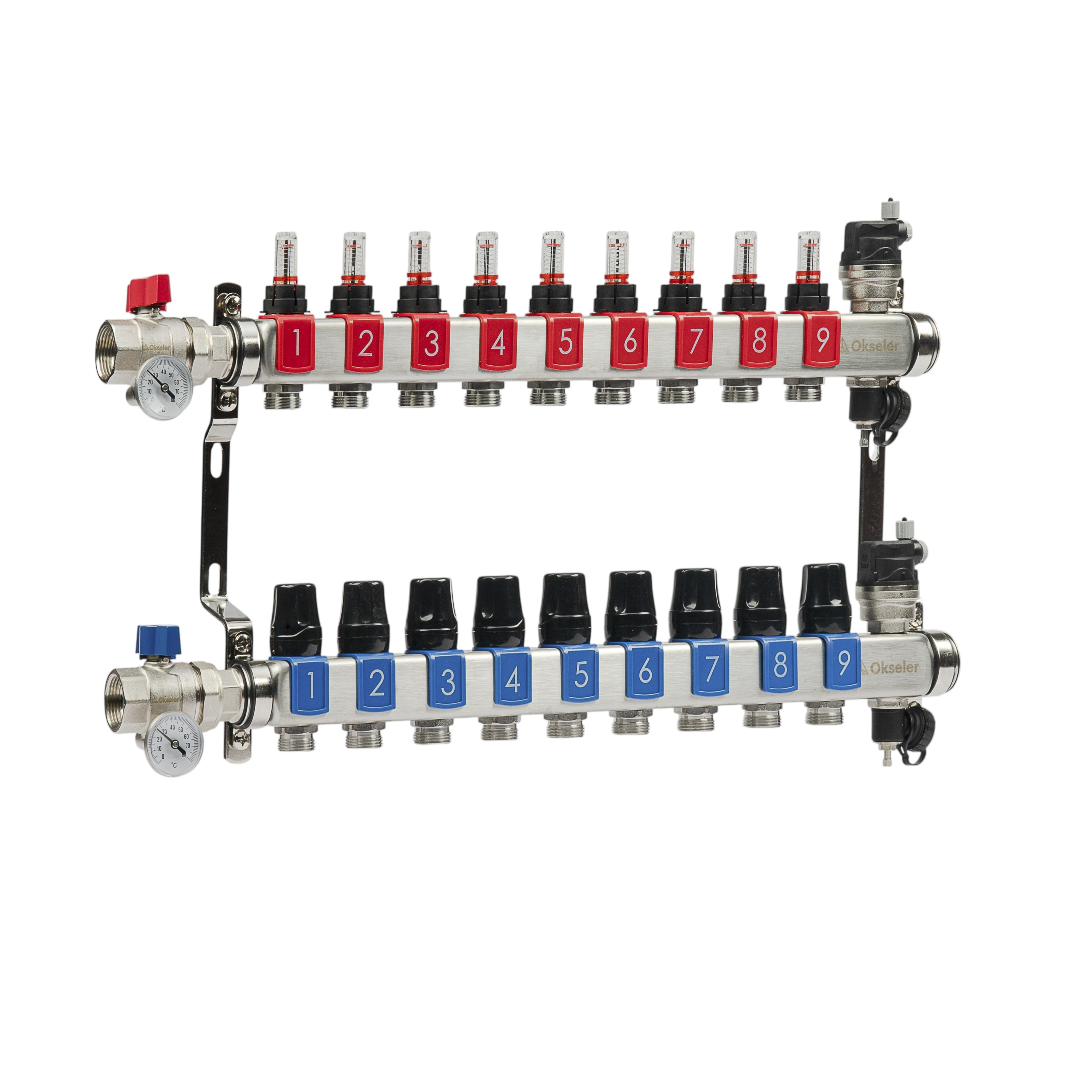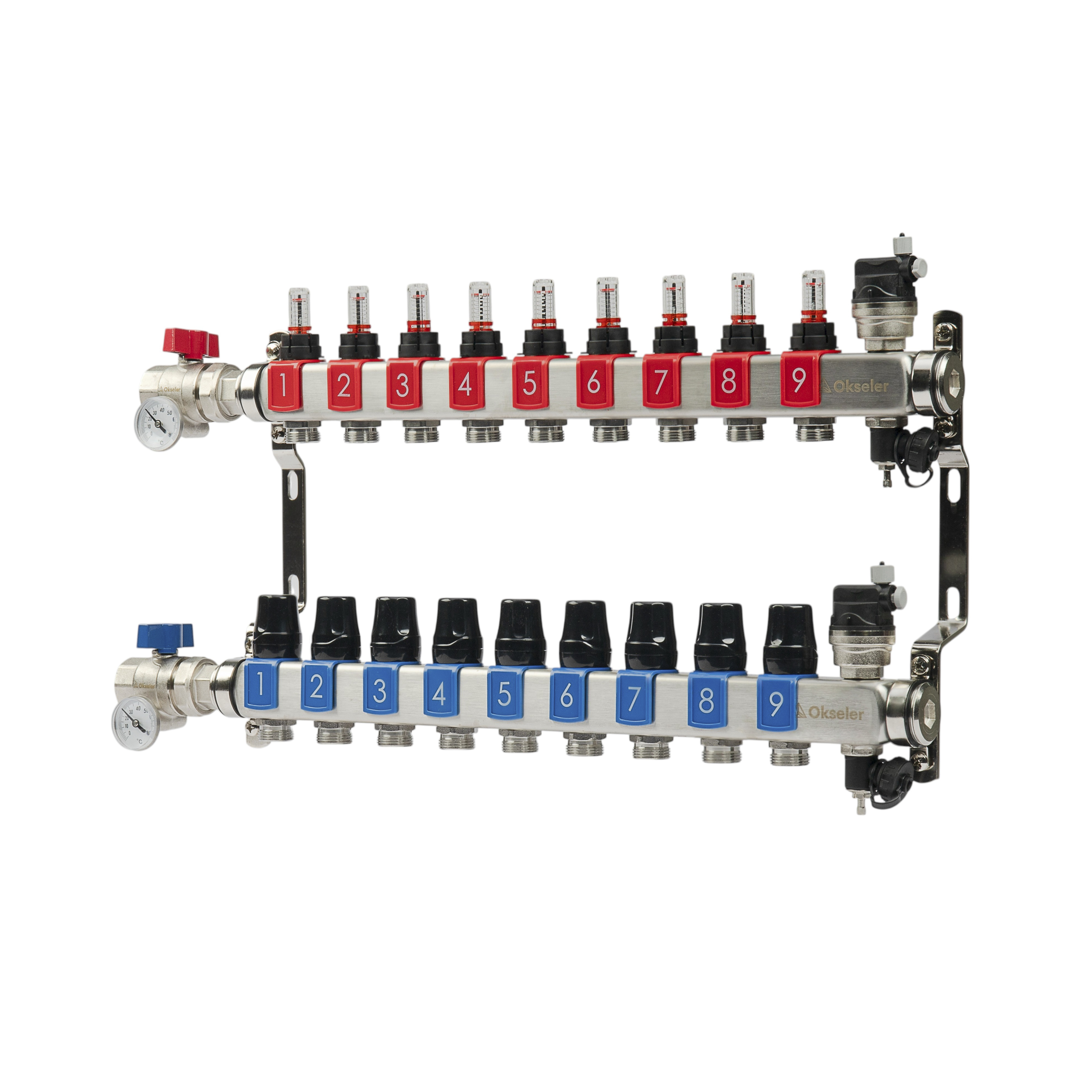 Коллекторный блок OKSELER на 9 выхода с расходомерами и автоматическими воздухоотводчиками предназначен для систем водяного отопления и теплого пола. Обеспечивает точное распределение теплоносителя по двум контурам с контролем расхода и температуры.