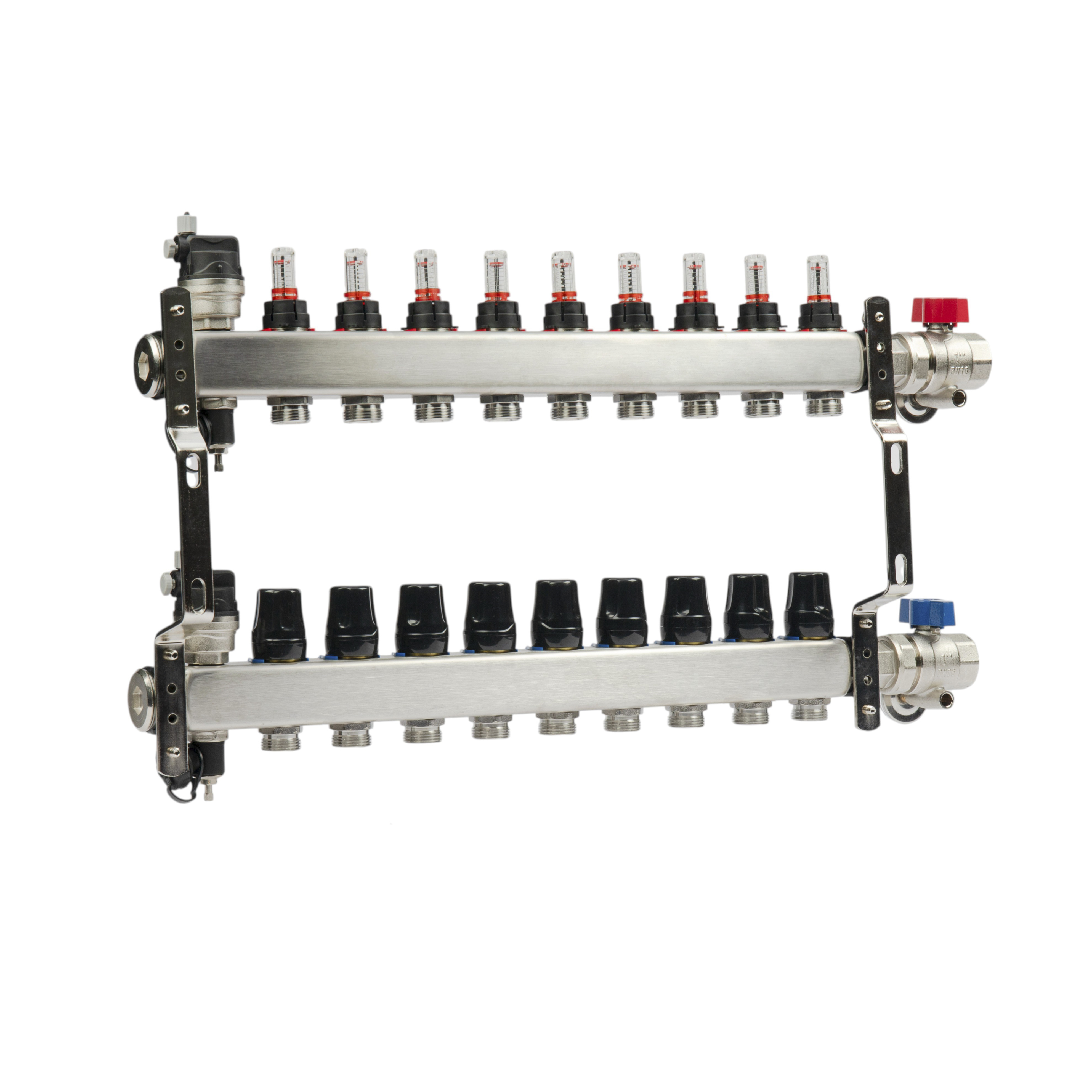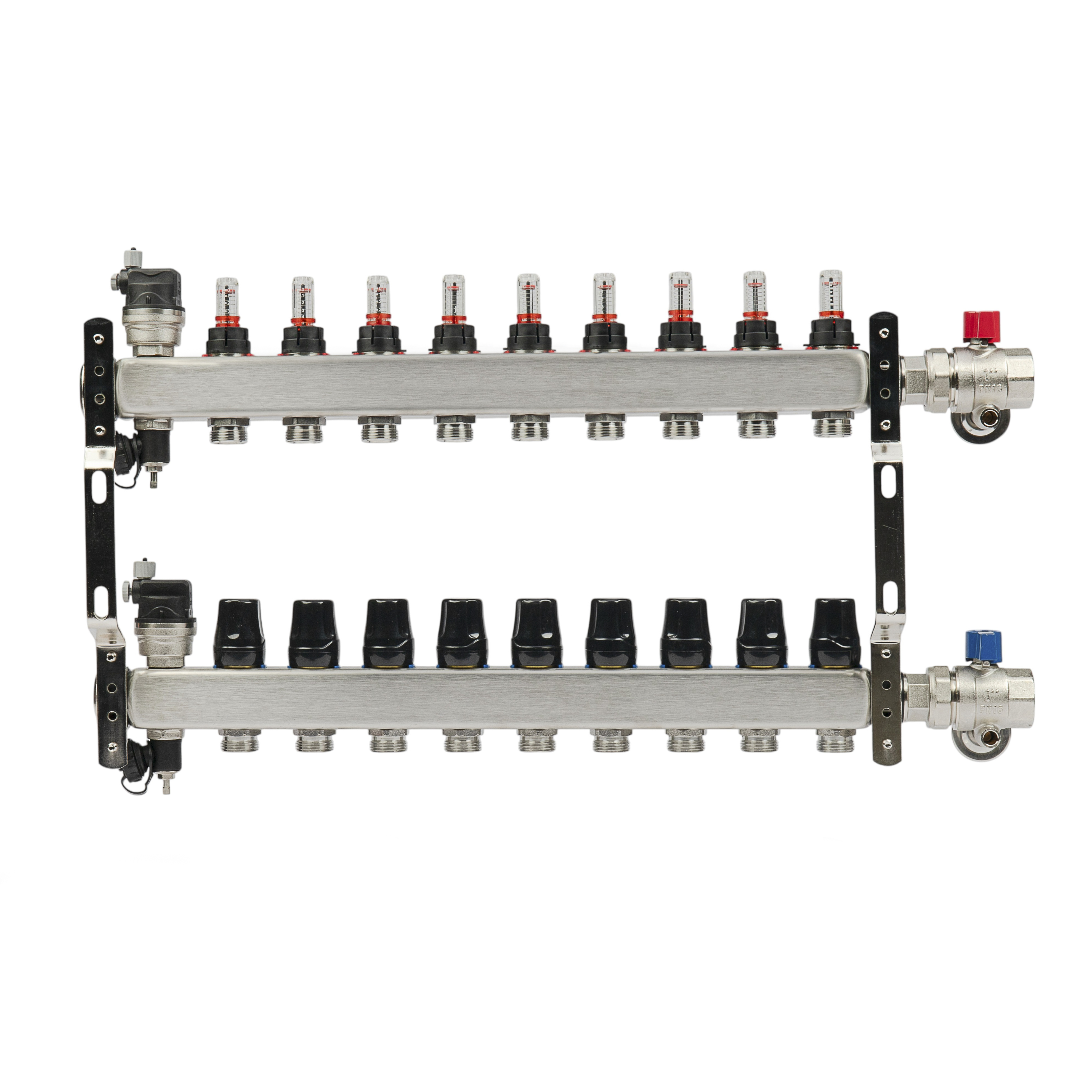 Коллекторная группа 9 отводов 1"*3/4"(18) ЕК с расходомерами Okseler (нерж.ст) с автоматическими воздухоотводчикоми и шаровыми кранами с термометрами