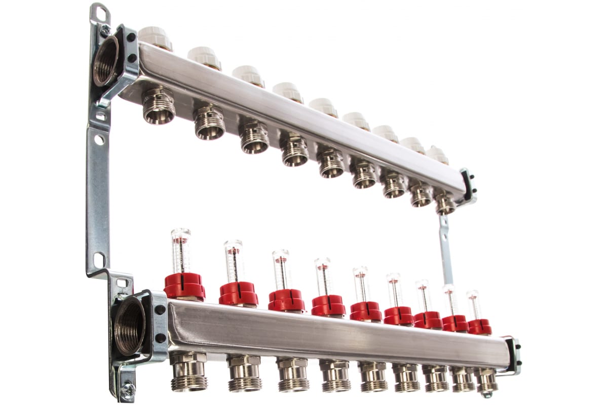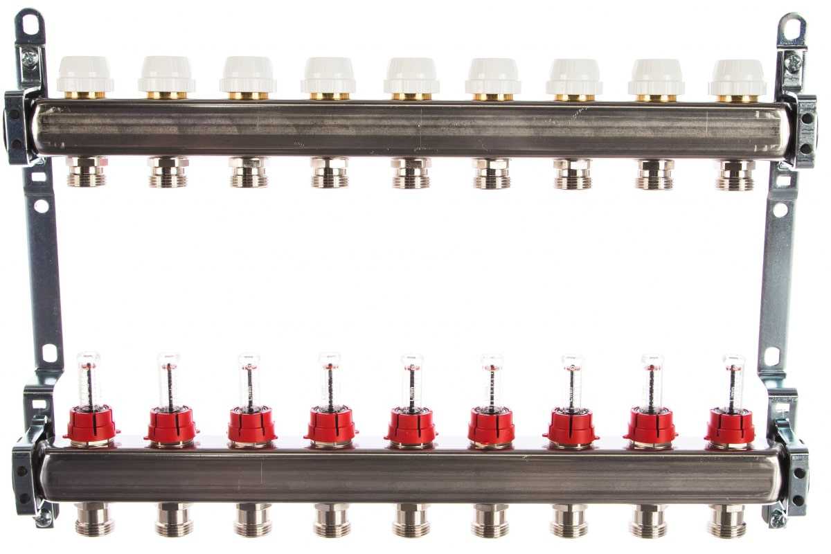 Коллектор из нержавеющей стали с расходомерами используется в системах отопления для подачи, распределения и регулировки потока теплоносителя. Наличие расходомеров дает возможность контролировать расход воды.