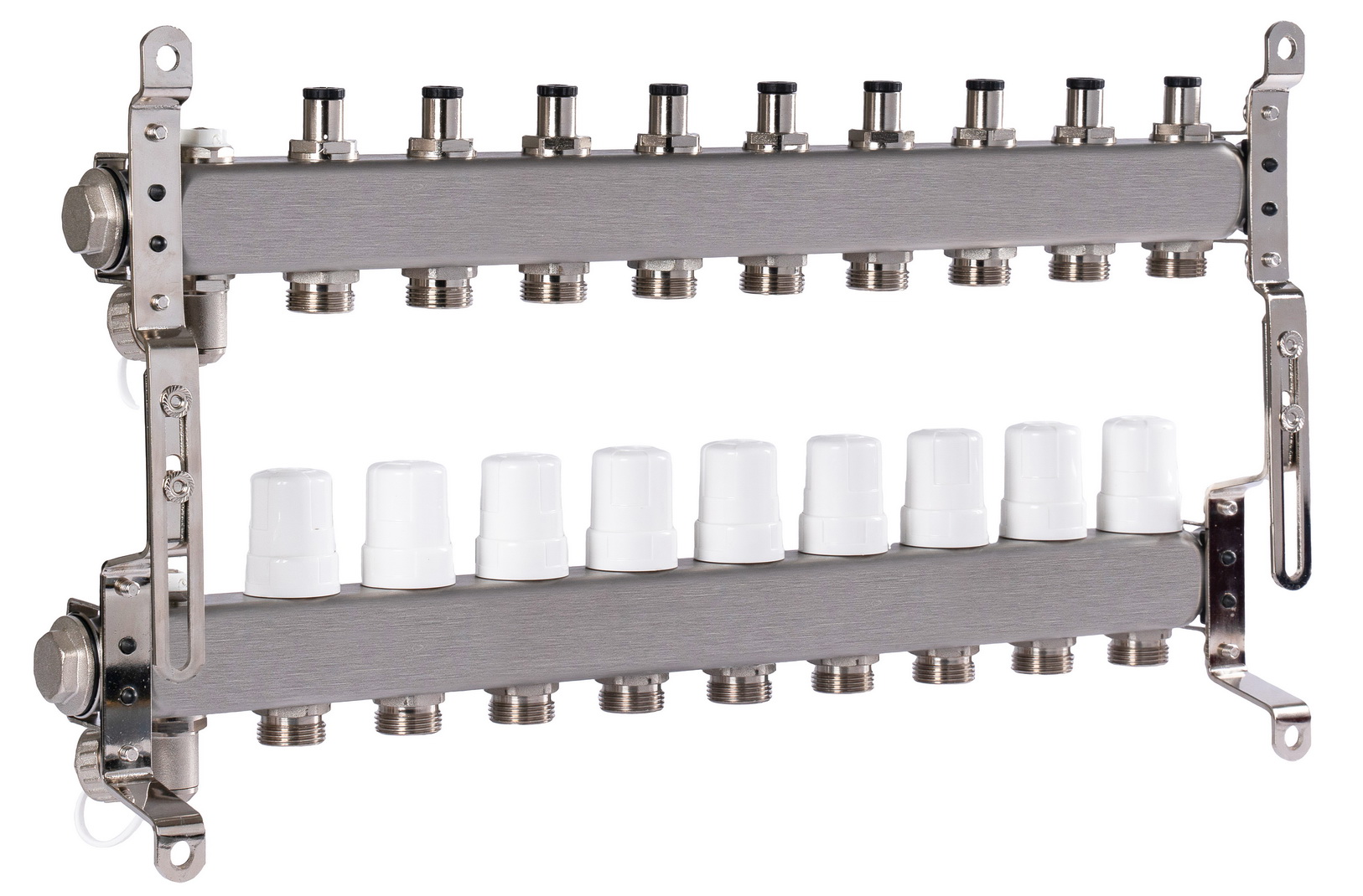 Коллекторный блок Okseler на 9 выходов с регулировочными и термостатическими клапанами — это универсальное и надёжное решение для систем тёплого пола и водяного отопления. Он обеспечивает эффективное распределение теплоносителя по 9 контурам, позволяя гибко регулировать температуру в каждом помещении. Подающая гребёнка оснащена ручными балансировочными клапанами, обратная — термостатическими клапанами с возможностью подключения термоэлектрических сервоприводов.