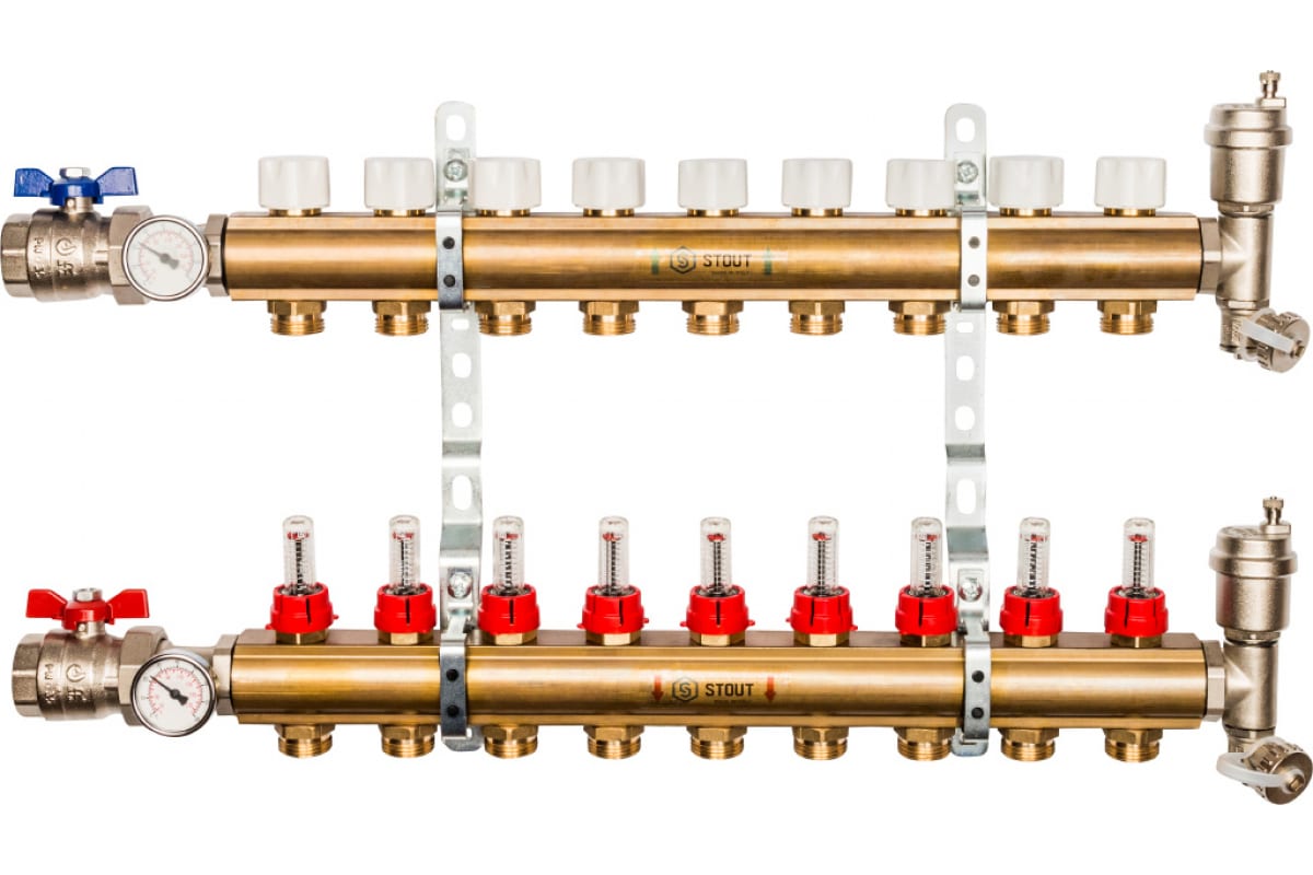 Коллекторная группа 9 отводов 1"x3/4"(18)EK в сборе с расходомерами Stout (латунь) (SMB-0473-000009)