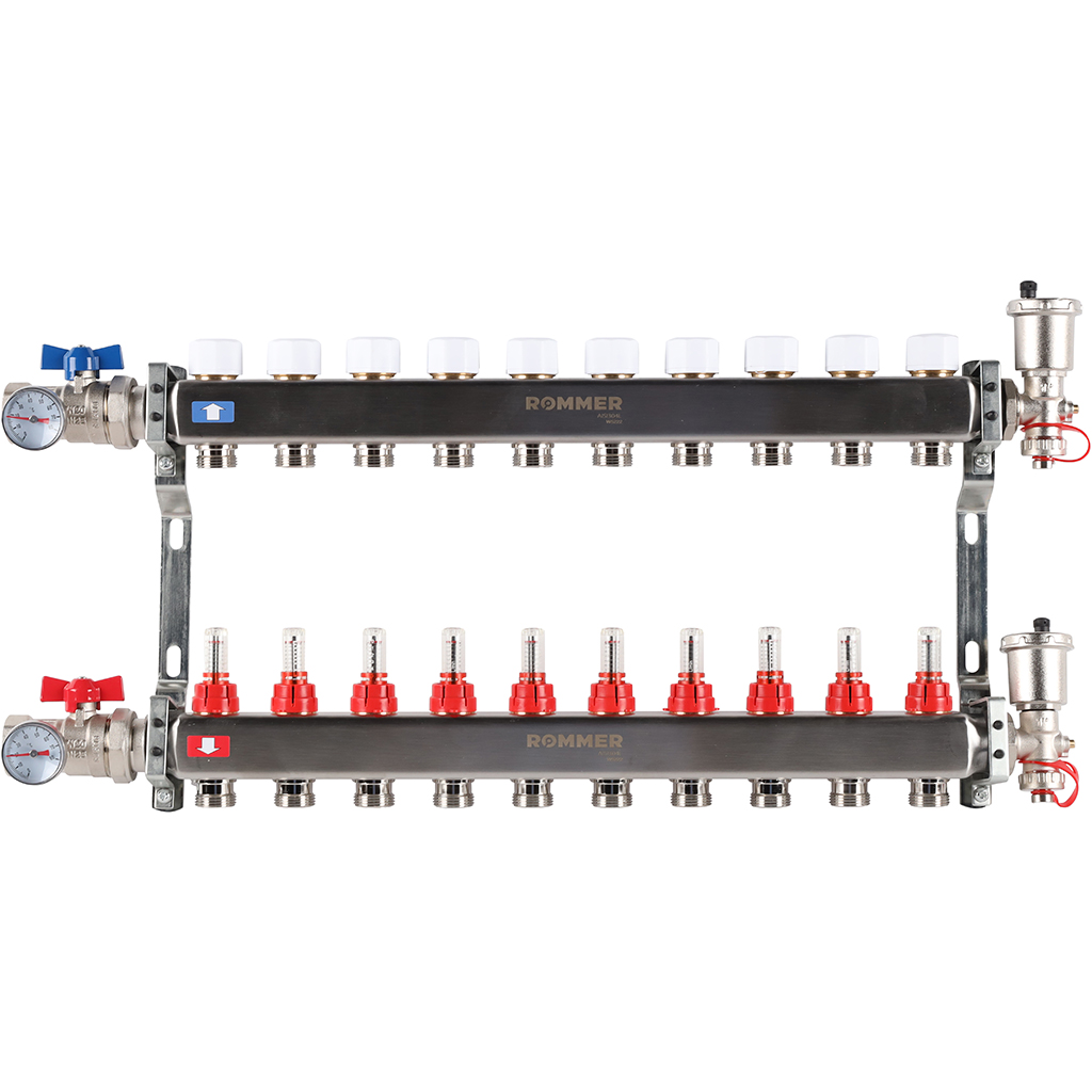 Коллекторная группа Rommer 10 отводов 1"x3/4" в сборе с расходомерами (нерж.сталь) (RMS-1210-000010)