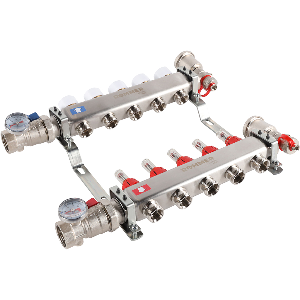 Коллектор из нержавеющей стали Rommer в сборе с расходомерами широко используется в системах водяного теплого пола или для подключения отопительных приборов. Производство коллекторных блоков осуществляется из высококачественных материалов, с применением тщательного контроля, многочисленных тестов и сертификации продукции.