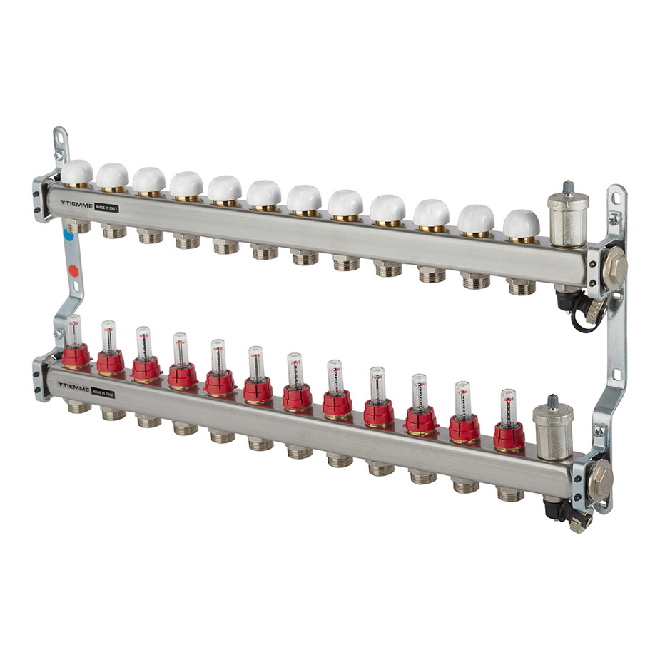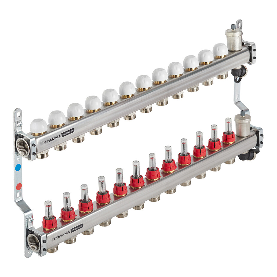 Коллекторная группа Tiemme 12 отводов 1"-3/4" НР ЕК M30х1,5 мм. с расходомерами (нерж.ст) (3920138)
