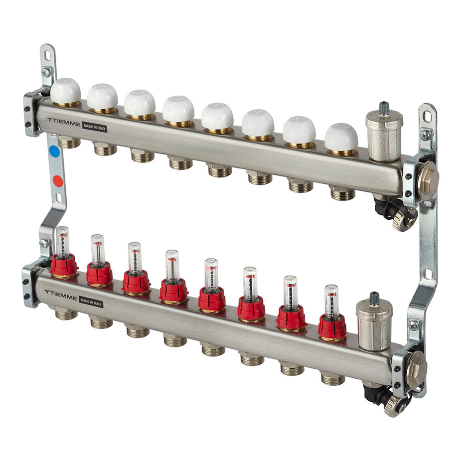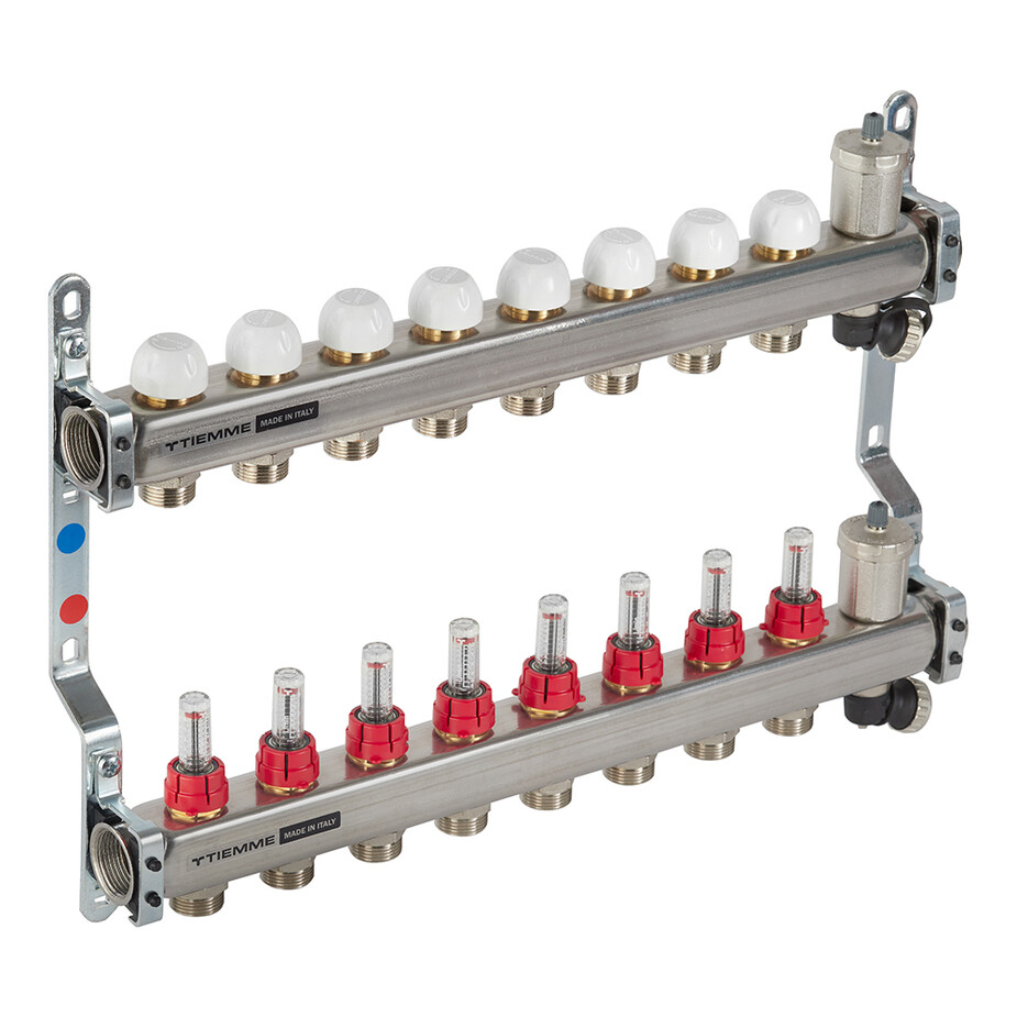 Коллекторная группа Tiemme 8 отводов 1"-3/4" НР ЕК M30х1,5 мм. с расходомерами (нерж.ст) (3920134)
