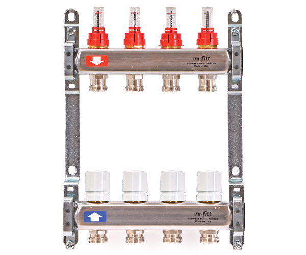 Коллекторная группа 1"" Uni-Fitt модель 450B из нержавеющей стали 2 выхода 3/4"" с расходомерами и термостатическими вентилями без концевиков предназначена для распределения и регулирования потоков теплоносителя в низко- или высокотемпературных системах отопления. Коллекторы оснащены расходомерами на подающем коллекторе и термостатическими вентилями (с возможностью установки термоэлектрических приводов) на обратном коллекторе. В комплект поставки не входят концевые вентиля (воздухоотводчики и дренажные клапаны) и автоматические воздухоотводчики. Коллекторная группа состоит из двух стальных коллекторов, смонтированных на звукоизолирующих консолях.