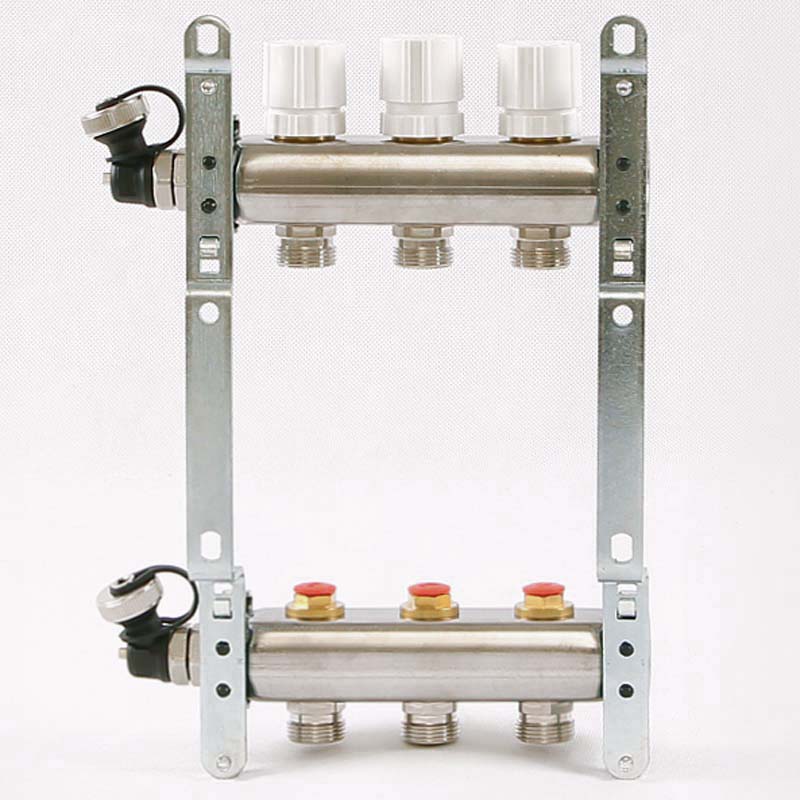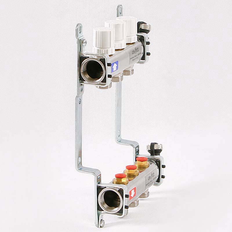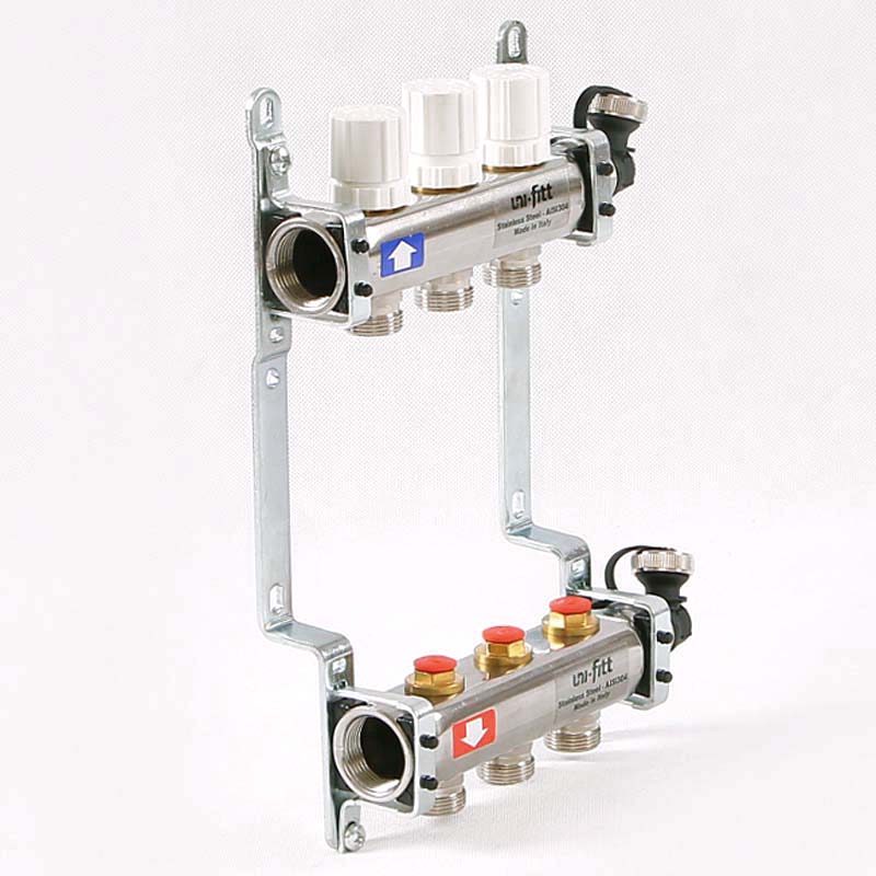 Коллекторная группа из нержавеющей стали с регулировочными и термостатическими вентилями Uni-Fitt 1"" х 3/4"" EK 3 выхода модель 451I с концевыми вентилями предназначена для распределения и регулирования потоков теплоносителя в низко- или высокотемпературных системах отопления. Коллекторы оснащены регулировочными вентилями на подающем коллекторе и термостатическими вентилями (с возможностью установки термоэлектрических приводов) на обратном коллекторе. В комплект поставки входят концевые вентиля: воздухоотводчики и дренажные клапаны. Коллекторная группа состоит из двух стальных коллекторов, смонтированных на звукоизолирующих консолях.