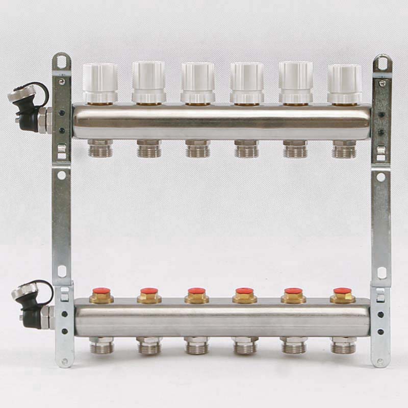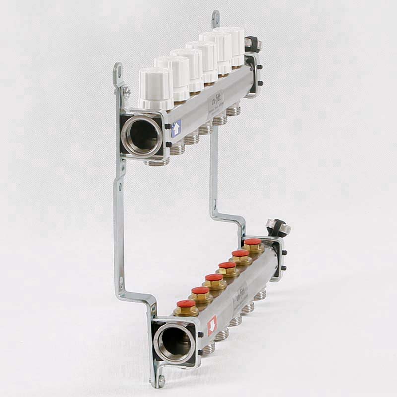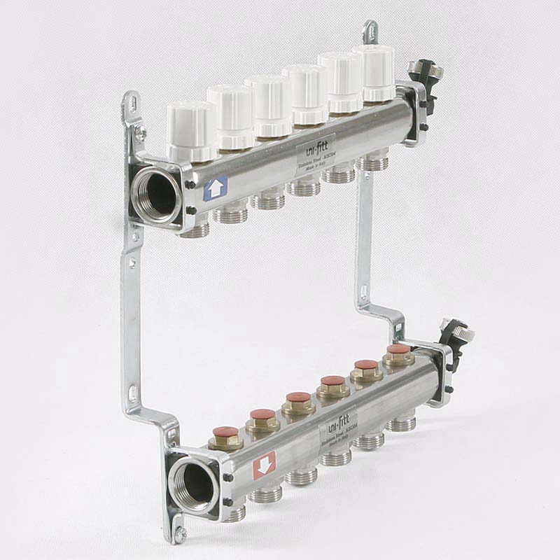 Коллекторная группа из нержавеющей стали с регулировочными и термостатическими вентилями Uni-Fitt 1"" х 3/4"" EK 6 выходов модель 451I с концевыми вентилями предназначена для распределения и регулирования потоков теплоносителя в низко- или высокотемпературных системах отопления. Коллекторы оснащены регулировочными вентилями на подающем коллекторе и термостатическими вентилями (с возможностью установки термоэлектрических приводов) на обратном коллекторе. В комплект поставки входят концевые вентиля: воздухоотводчики и дренажные клапаны. Коллекторная группа состоит из двух стальных коллекторов, смонтированных на звукоизолирующих консолях.