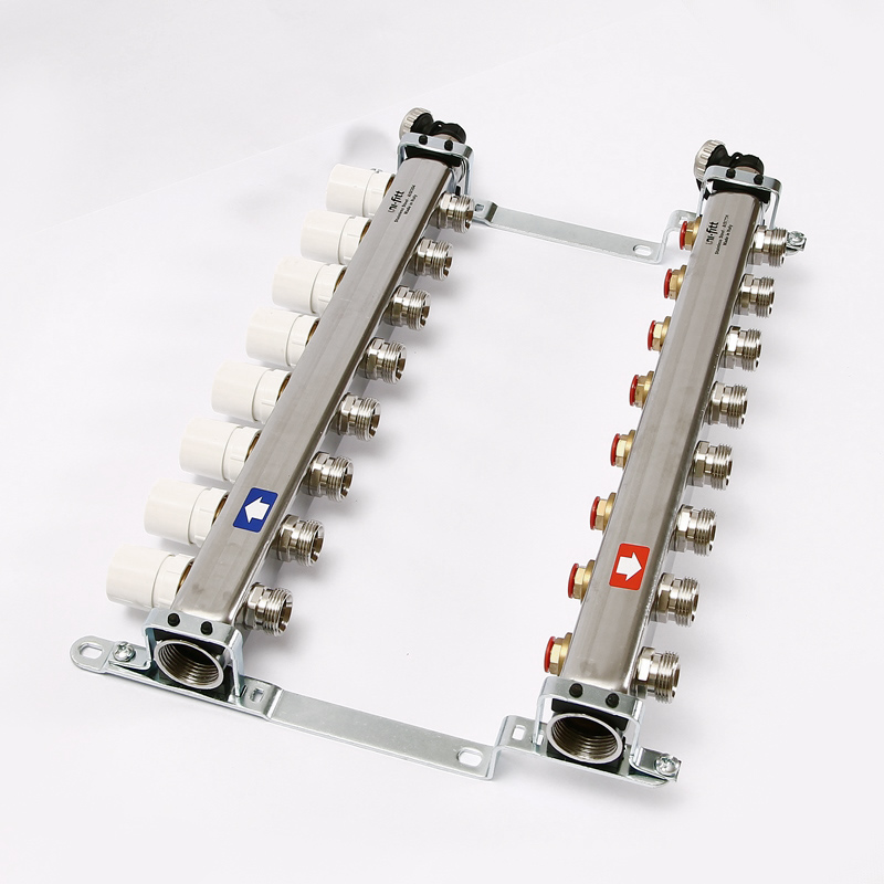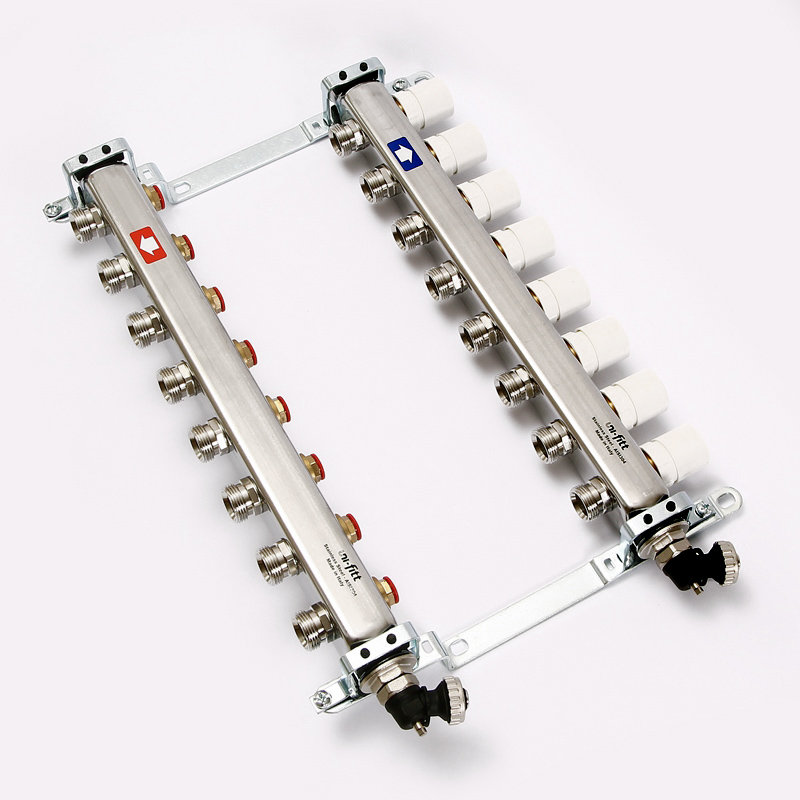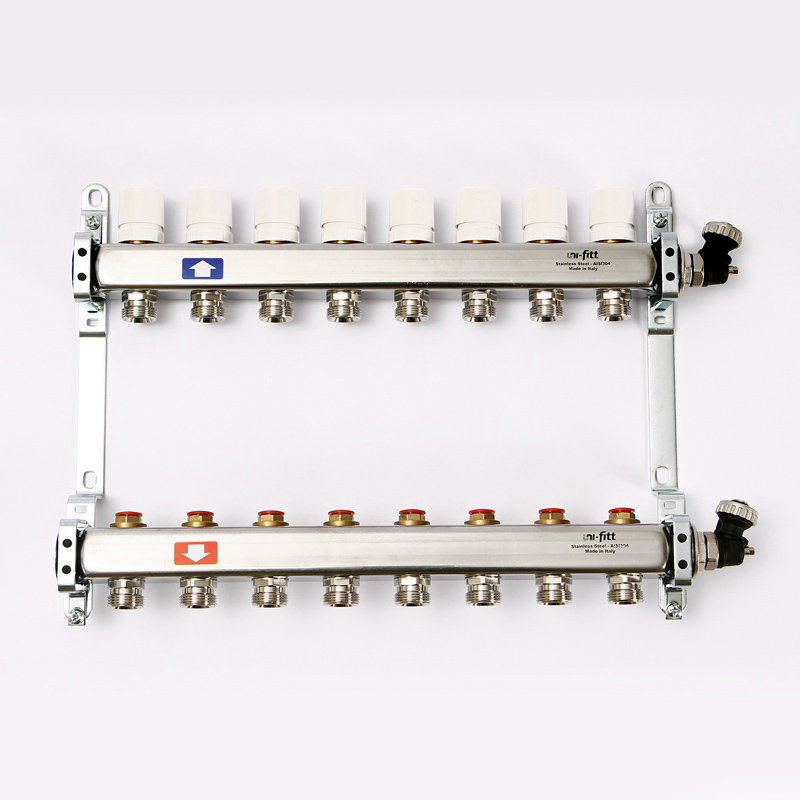 Коллекторная группа из нержавеющей стали с регулировочными и термостатическими вентилями Uni-Fitt 1"" х 3/4"" EK 8 выходов модель 451I с концевыми вентилями предназначена для распределения и регулирования потоков теплоносителя в низко- или высокотемпературных системах отопления. Коллекторы оснащены регулировочными вентилями на подающем коллекторе и термостатическими вентилями (с возможностью установки термоэлектрических приводов) на обратном коллекторе. В комплект поставки входят концевые вентиля: воздухоотводчики и дренажные клапаны. Коллекторная группа состоит из двух стальных коллекторов, смонтированных на звукоизолирующих консолях.