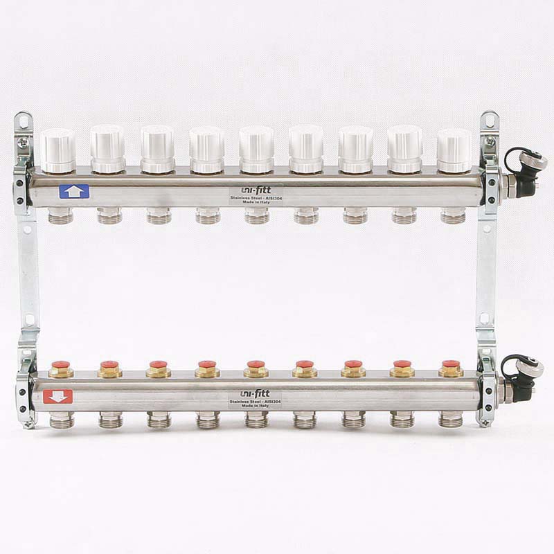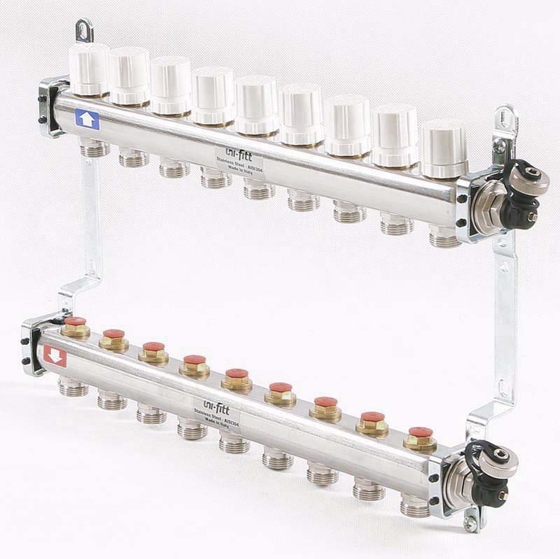 Коллекторная группа из нержавеющей стали с регулировочными и термостатическими вентилями Uni-Fitt 1"" х 3/4"" EK 9 выходов модель 451I с концевыми вентилями предназначена для распределения и регулирования потоков теплоносителя в низко- или высокотемпературных системах отопления. Коллекторы оснащены регулировочными вентилями на подающем коллекторе и термостатическими вентилями (с возможностью установки термоэлектрических приводов) на обратном коллекторе. В комплект поставки входят концевые вентиля: воздухоотводчики и дренажные клапаны. Коллекторная группа состоит из двух стальных коллекторов, смонтированных на звукоизолирующих консолях.