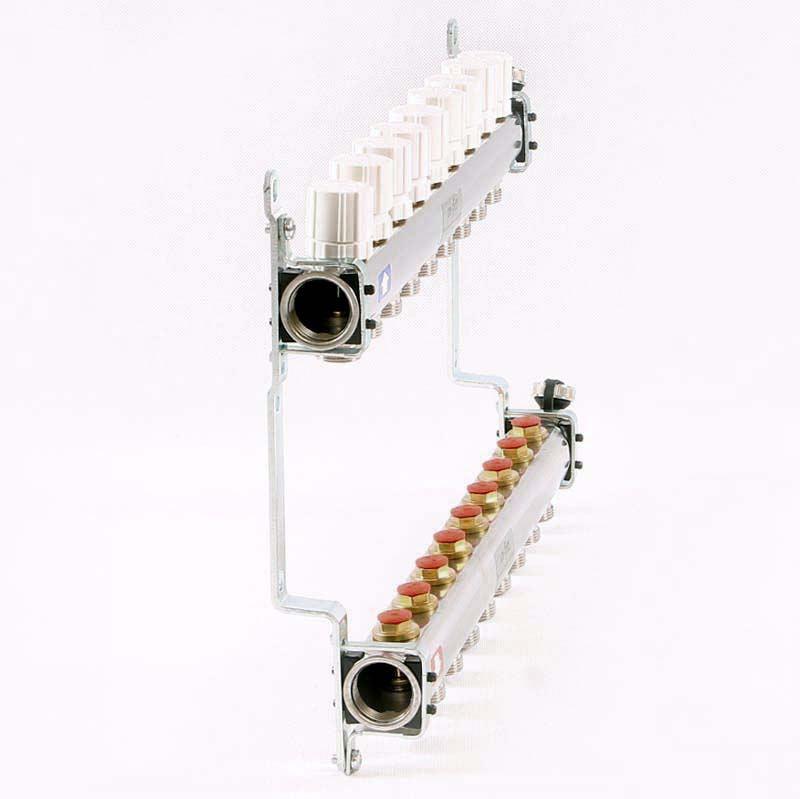 На каждом отводе подающего коллектора установлены регулирующие вентили или расходомеры, комбинированные с балансировочными вентилями. Такая конструкция позволяет отрегулировать (сбалансировать) контуры системы отопления. Использование коллекторных групп с расходомерами позволяет произвести настройку, ориентируясь на объективные данные. Расходомеры показывают расход от 0 до 6 л/мин. При необходимости (например – для очистки) колбу расходомера можно снять и установить обратно без слива системы. Данная модель коллекторных групп не имеет расходомеров.