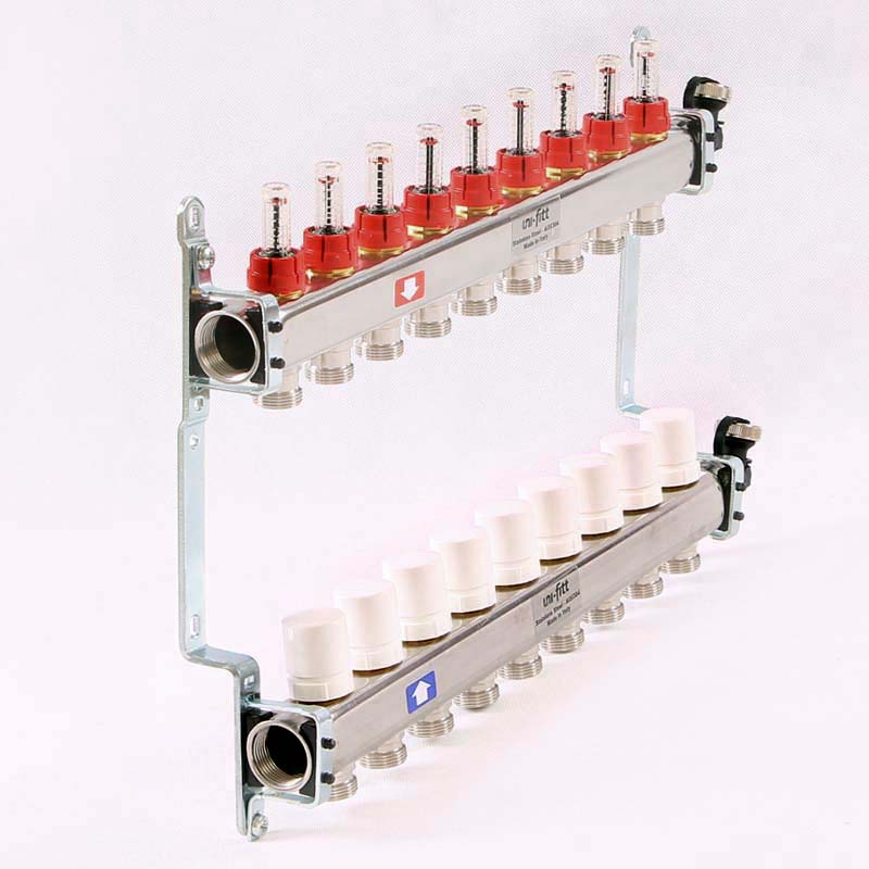 Коллекторная группа из нержавеющей стали с расходомерами и термостатическими вентилями Uni-Fitt 1"" х 3/4"" EK 9 выходов предназначена для распределения и регулирования потоков теплоносителя в низко- или высокотемпературных системах отопления. Коллекторы оснащены расходомерами на подающем коллекторе и термостатическими вентилями (с возможностью установки термоэлектрических приводов) на обратном коллекторе. Каждое устройство укомплектовано дренажным клапаном / воздухоотводчиком, который может быть использован для заполнения системы. Коллекторная группа состоит из двух стальных коллекторов, смонтированных на звукоизолирующих консолях.