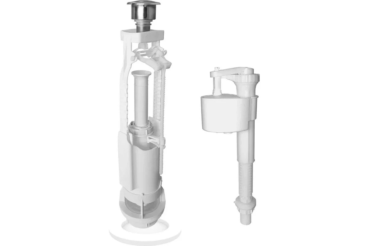Сливной клапан: однокнопочный слив воды с системой "Старт-Стоп". Система "Старт-Стоп" предусматривает остановку подачи воды из бачка по второму нажатию кнопки клапана (при первом нажатии кнопки клапан открывается, при этом подача воды прекратится при опустошении бачка или при повторном нажатии кнопки клапана). Кнопка металлизированная. Наполнительный клапан: нижний подвод воды, телескопический, штуцер полипластик 1/2, бесшумное наполнение. Комплект прокладок.