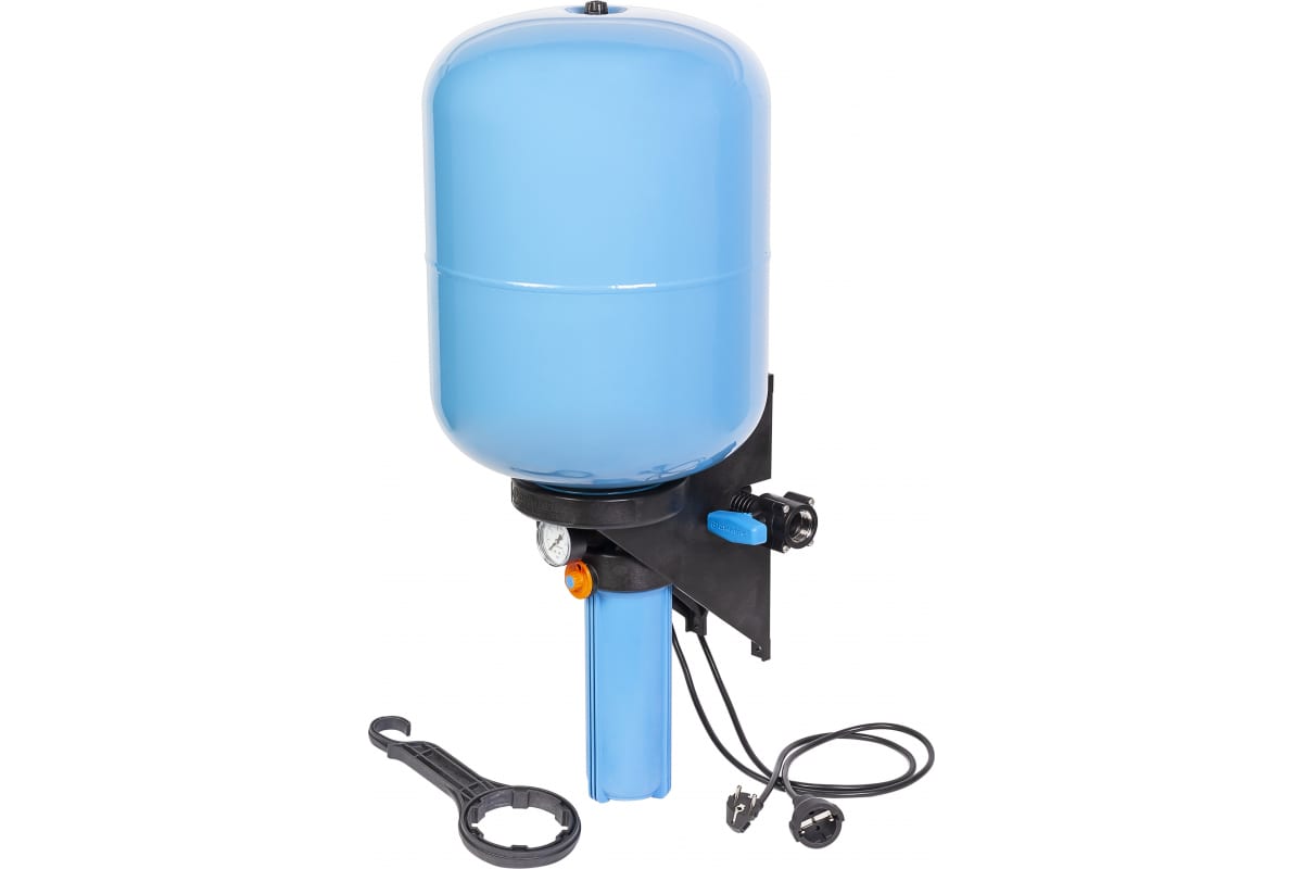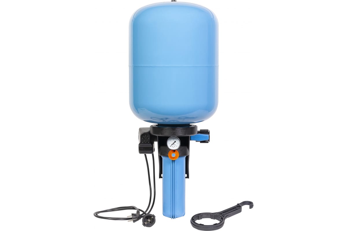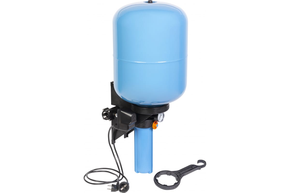 Комплектация: Гидроаккумулятор 50 л., колба 1 МС 10", ключ для корпуса картриджного фильтра, шаровый кран, реле давления, манометр, коллектор, соединительный кронштейн, два резьбовых штуцера, обратный клапан