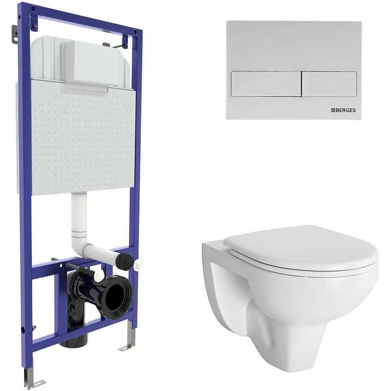 Полный Комплект BERGES для монтажа подвесного унитаза:инсталляция NOVUM525: толщина бачка 80 мм, смыв 3/6 литра, нагрузка 400 кг, антикоррозийное покрытие, кнопка L4 белая SoftTouch, пластик, унитаз GAMMA: Каскадный смыв, сидение дюропласт Gamma: микролифт,быстросъемное. Все крепежи для установки в комплекте. Возможность установки в угол.