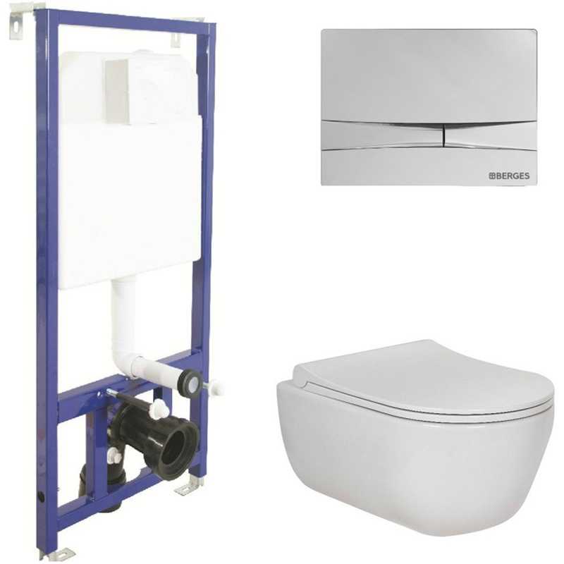 Комплект инсталляция с унитазом Berges: инсталляция NOVUM525, кнопка F3 хром глянец, унитаз EGO Rimless, сидение дюропласт Toma Slim SO, микро
