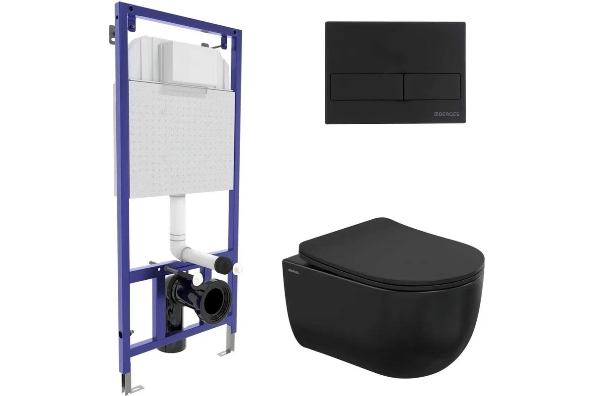 Комплект инсталляция с унитазом Berges: инсталляция Novum525, кнопка L5 soft touch черный, унитаз Ventas Black, сиденье с soft-close (043324)