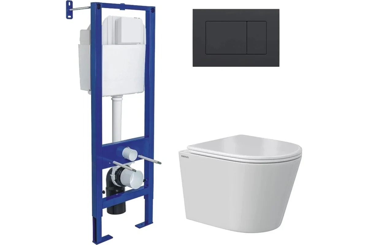Комплект инсталляция с унитазом Berges Atom кнопка черная Soft Touch, унитаз Vita Rimless 49 см, сиденье с soft-close (043385)