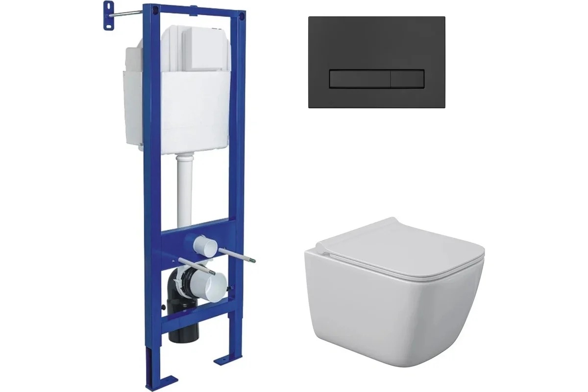 Комплект инсталляция с унитазом Berges Atom Line кнопка черная SoftTouch, унитаз Quattro S Rimless 49 см, сиденье с soft-close (043362)