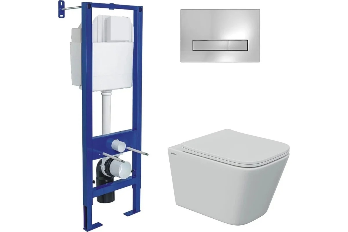 Комплект инсталляция с унитазом Berges Atom Line кнопка глянцевый хром, унитаз Floe S Rimless 51 см, сиденье с soft-close (043348)