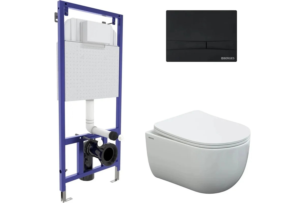 Комплект инсталляция с унитазом Berges Novum кнопка F5 Soft Touch черная, унитаз VENTAS Rimless 49 см, сиденье с soft-close (043344)