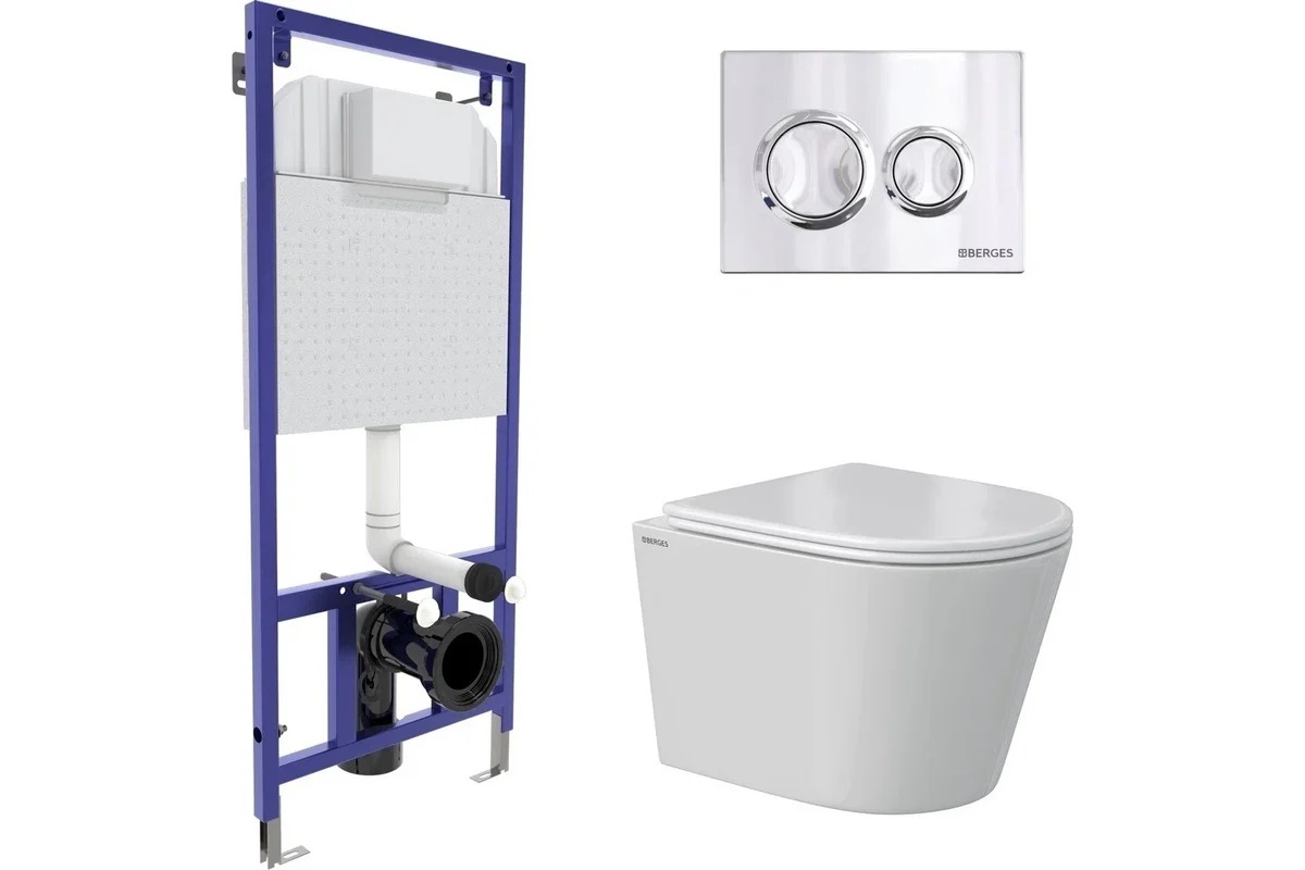 Полный Комплект BERGES для монтажа подвесного унитаза: инсталляция NOVUM525: толщина бачка 80 мм, резервуар воды объемом 10 литров с тепло-шумоизоляцией, объем смыва 3/6 литра с возможностью регулировки, нагрузка 400 кг, антикоррозийное покрытие, кнопка O3 хром глянец, пластик, унитаз VITA Rimless 49 см: Безободковый смыв, сиденье дюропласт: микролифт, быстросъемное. Все крепежи для установки в комплекте. Возможность установки в угол. Гарантия 10 лет.