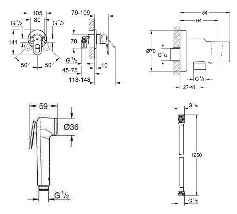 Комплект для гигиенического душа Grohe Bauloop встраиваемый смеситель, шланг, хром (124895)